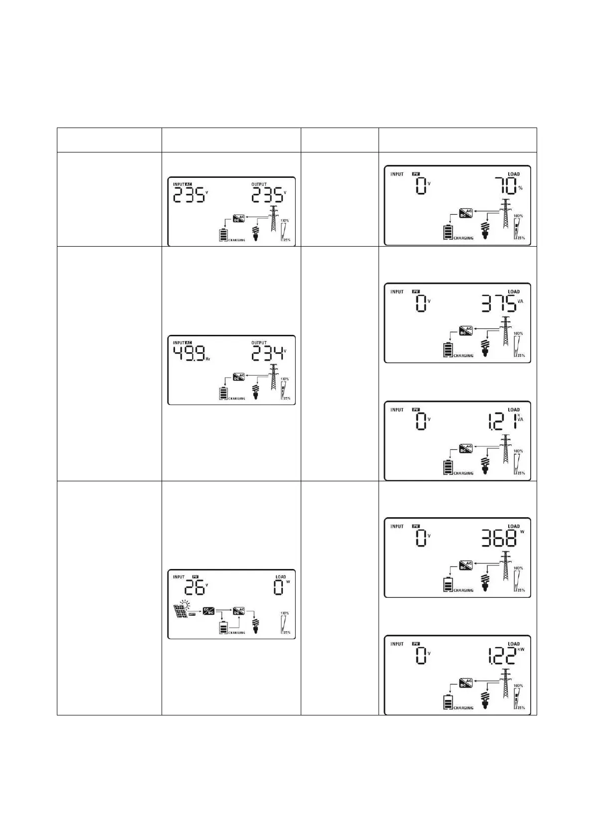 switched as below order: input voltage, input frequency, PV voltage, charging current, battery voltage, output
