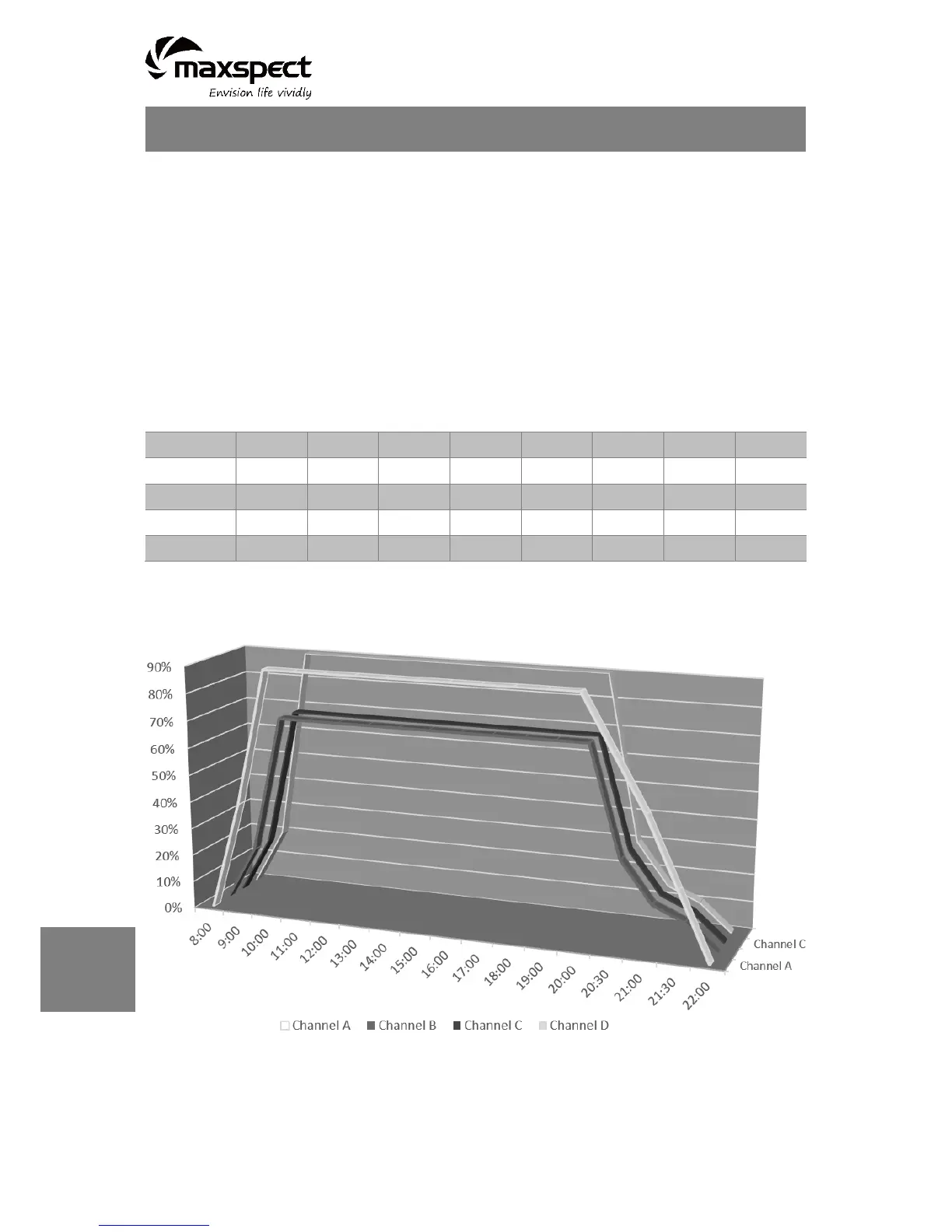 組開始逐漸變亮, 10:00 點達到最大亮度並一直維持到 20:00 點,然後 LED 燈組亮度開始下