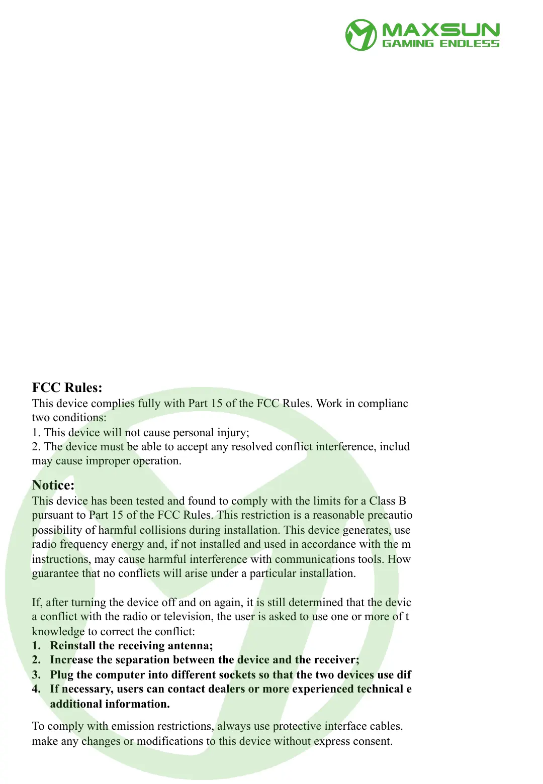 This device complies fully with Part 15 of the FCC Rules. Work in compliance with the following