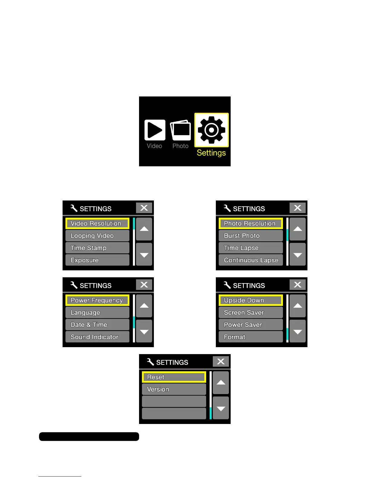 ‘Settings’highlightedinyellow,thenpressthe‘shutter’button.