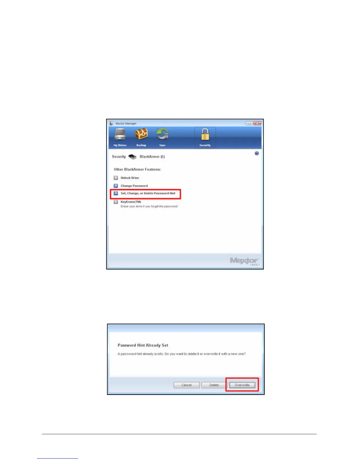 Step 1: Click the Security icon in the Maxtor Manager window.