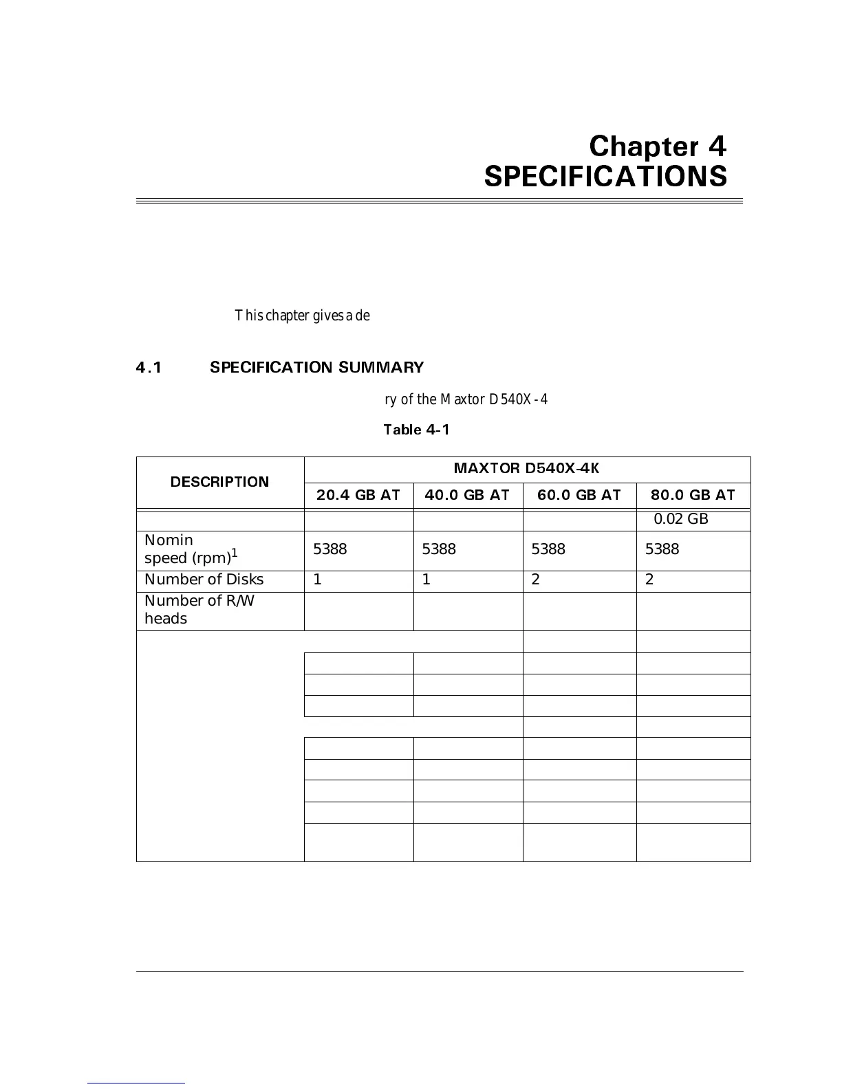 Table 4-1 gives a summary of the Maxtor D540X-4K hard disk drives.