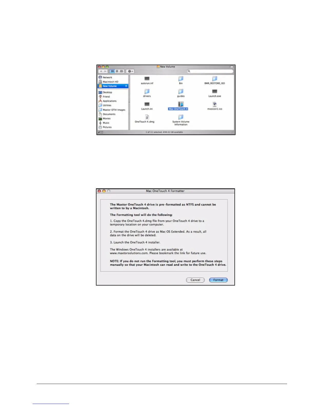 The New Volume Finder window contains the Mac OneTouch 4 Formatting Tool.