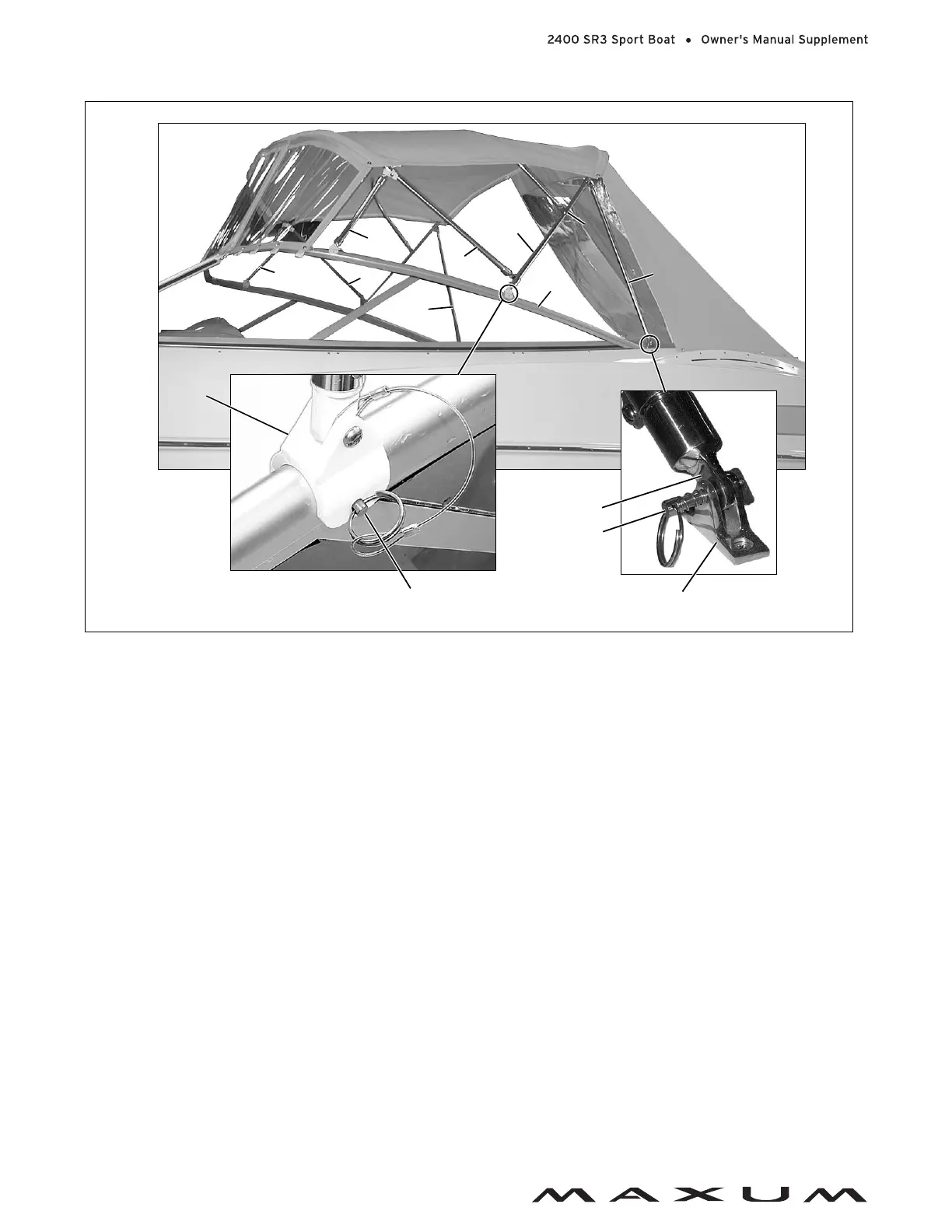1. Slide the swivel ends (A) of the main bow (B) over the aft pre-drilled holes in the windshield frames (C) and
