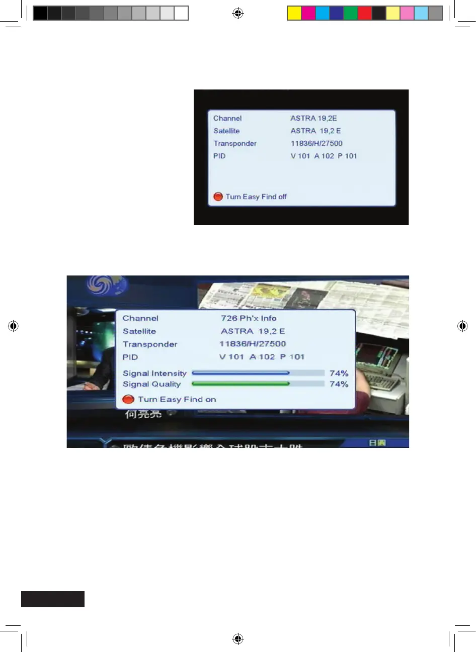 The Easy Find function is deselected by pressing the red function key. Signal strength and