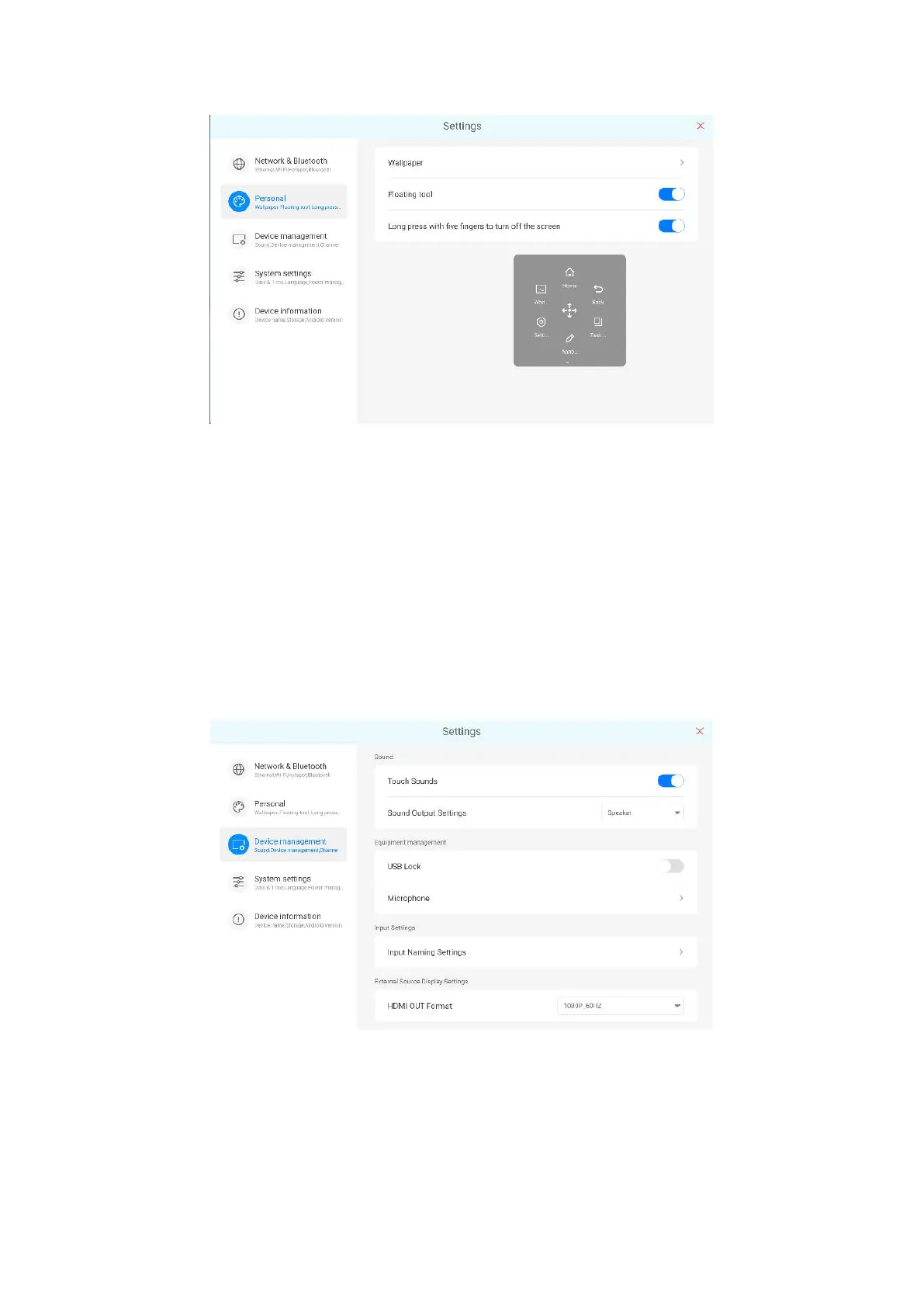 4. External signal source display Settings: 3840x2160_60HZ, 1080P_60HZ.