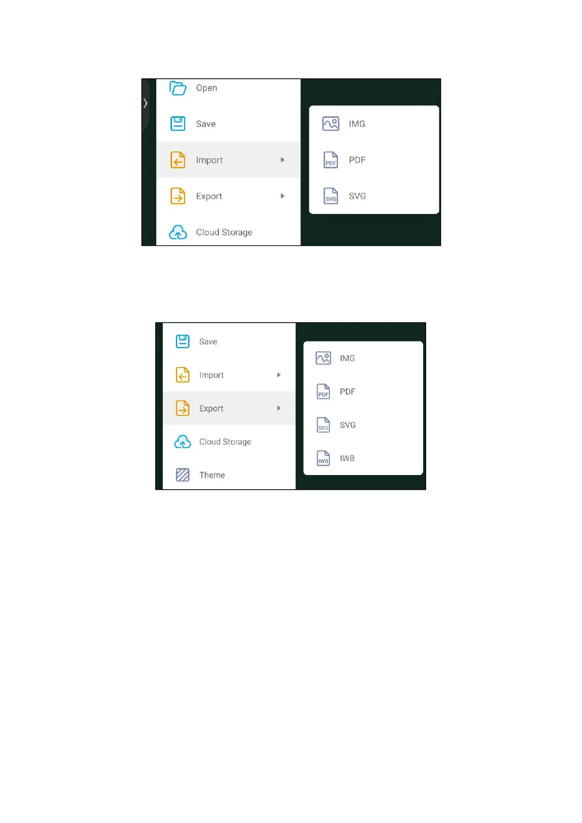 (5) Export: Import and save the white board in a certain file format, including