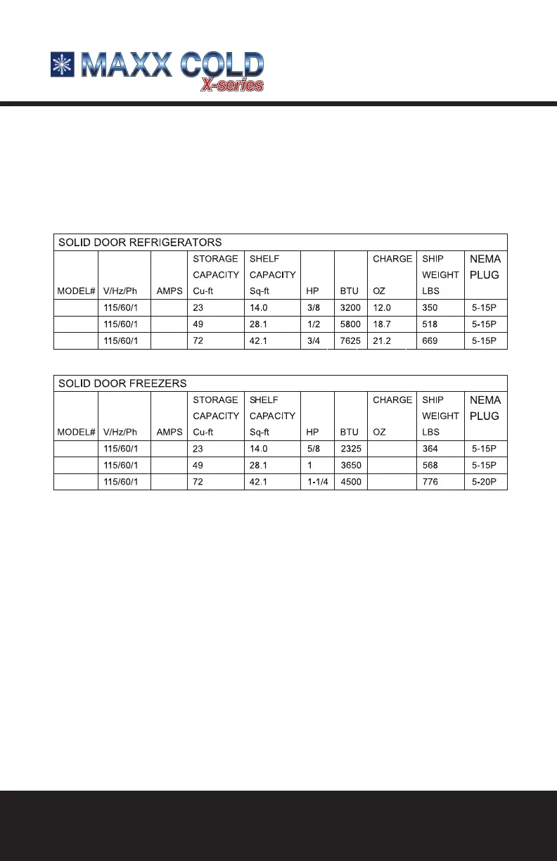 Maxx Cold X Series - SPECIFICATIONS; SOLID DOOR REFRIGERATORS; SOLID DOOR FREEZERS
