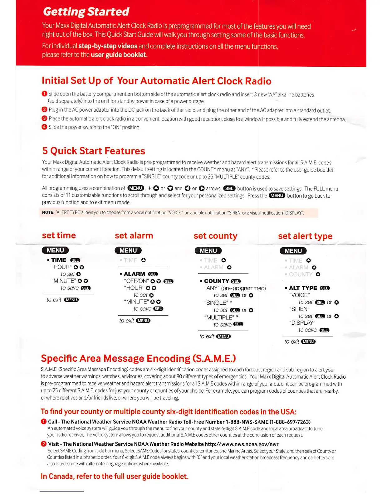 Maxx Digital MX-CR01NW - Getting Started; Initial Set Up of Your Automatic Alert Clock Radio; Quick Start Features; Specific Area Message Encoding (S.A.M.E.)