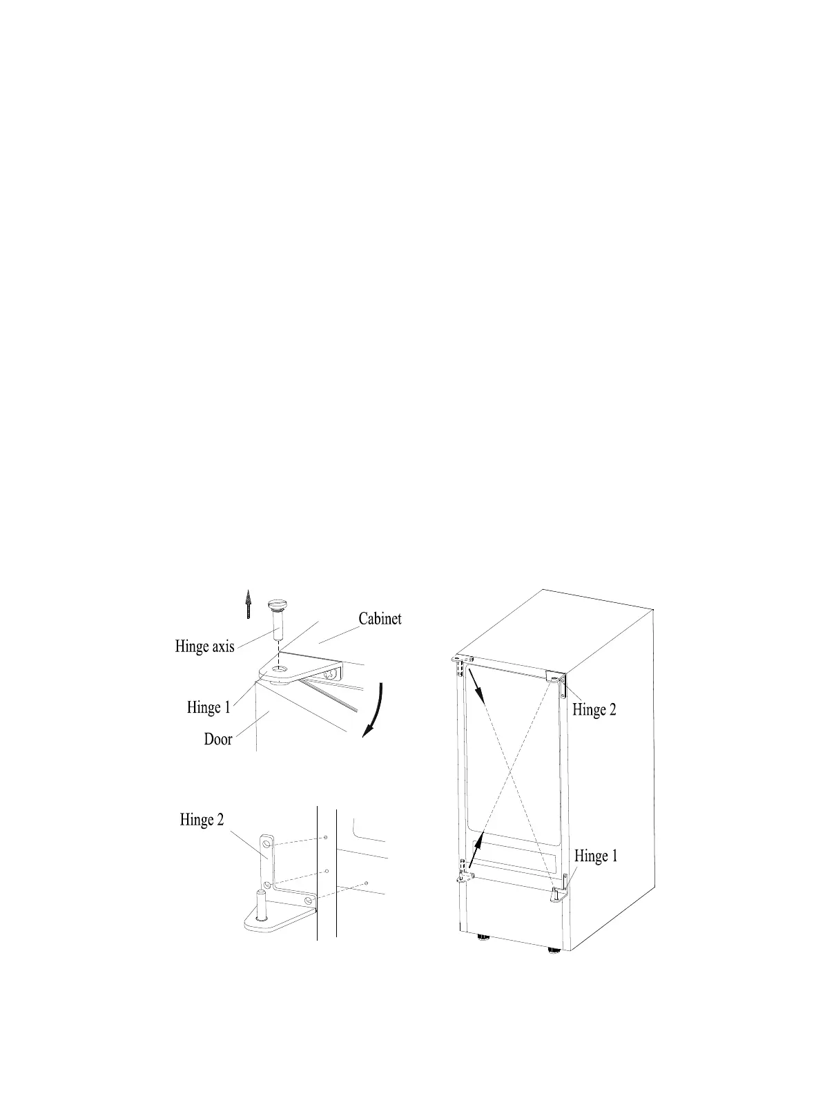 4. Align the door on Bottom Hinge 1 and replace axis on Hinge 2. Tighten it firmly.