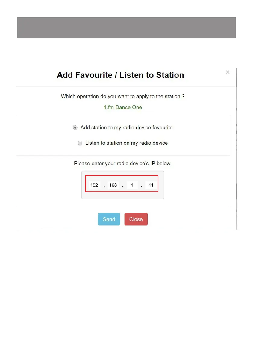 - It will prompt you whether to "Add Favourite" or "Listen to Station". Enter the IP