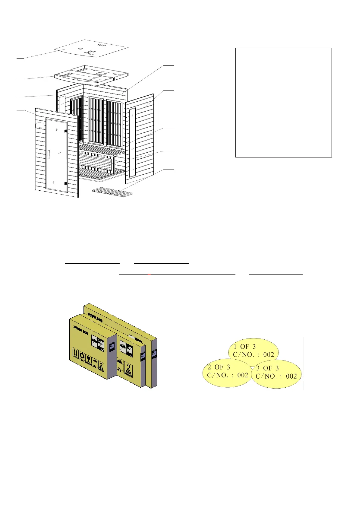 example: C/NO: 002 1 OF 2 and C/NO: 002 2 OF 2. 3-person sauna and 4-person saunas are packed in