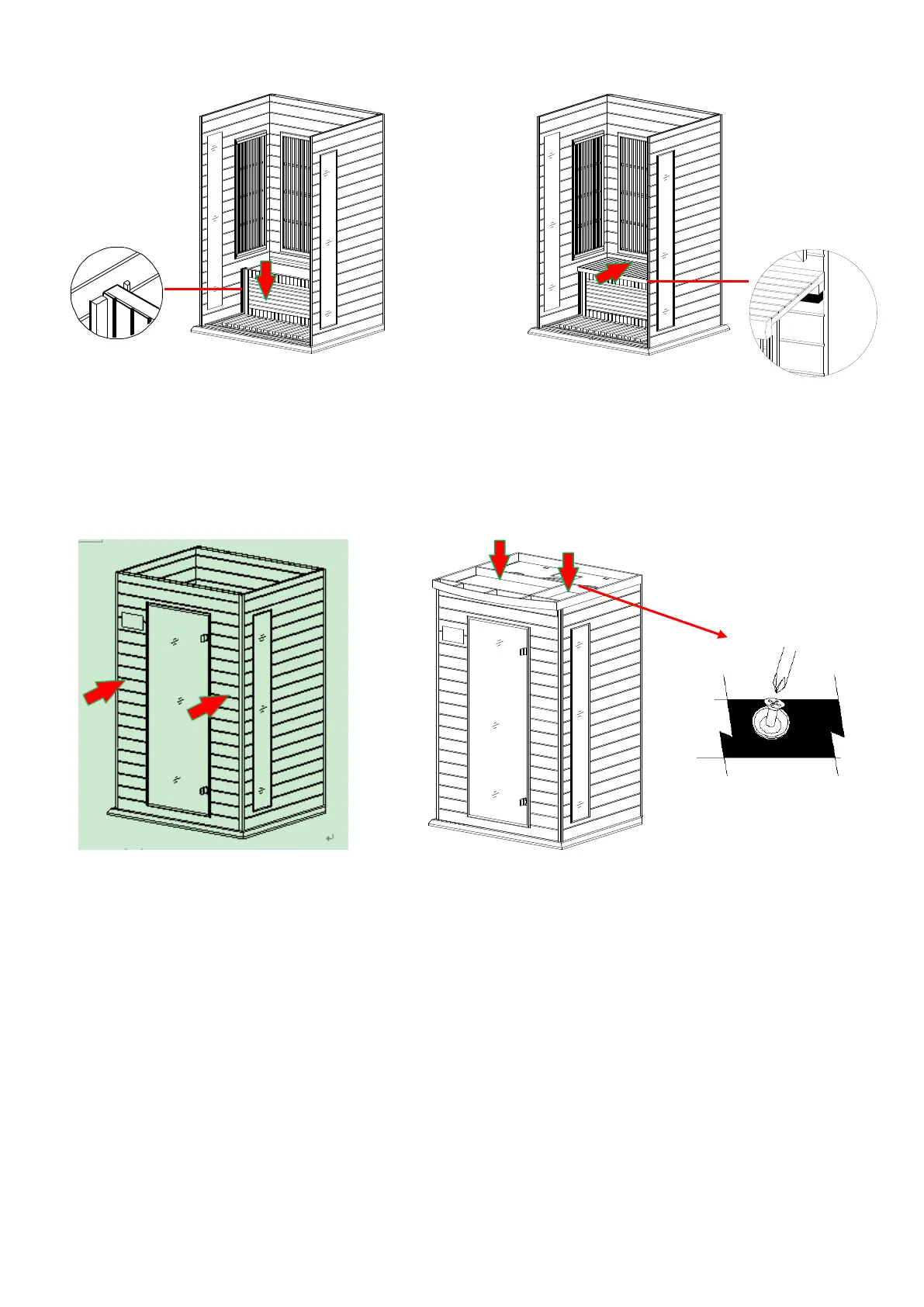 the roof installation. Open the door, lift the Roof Panel up and over the sauna room, and gently lower it into place resting