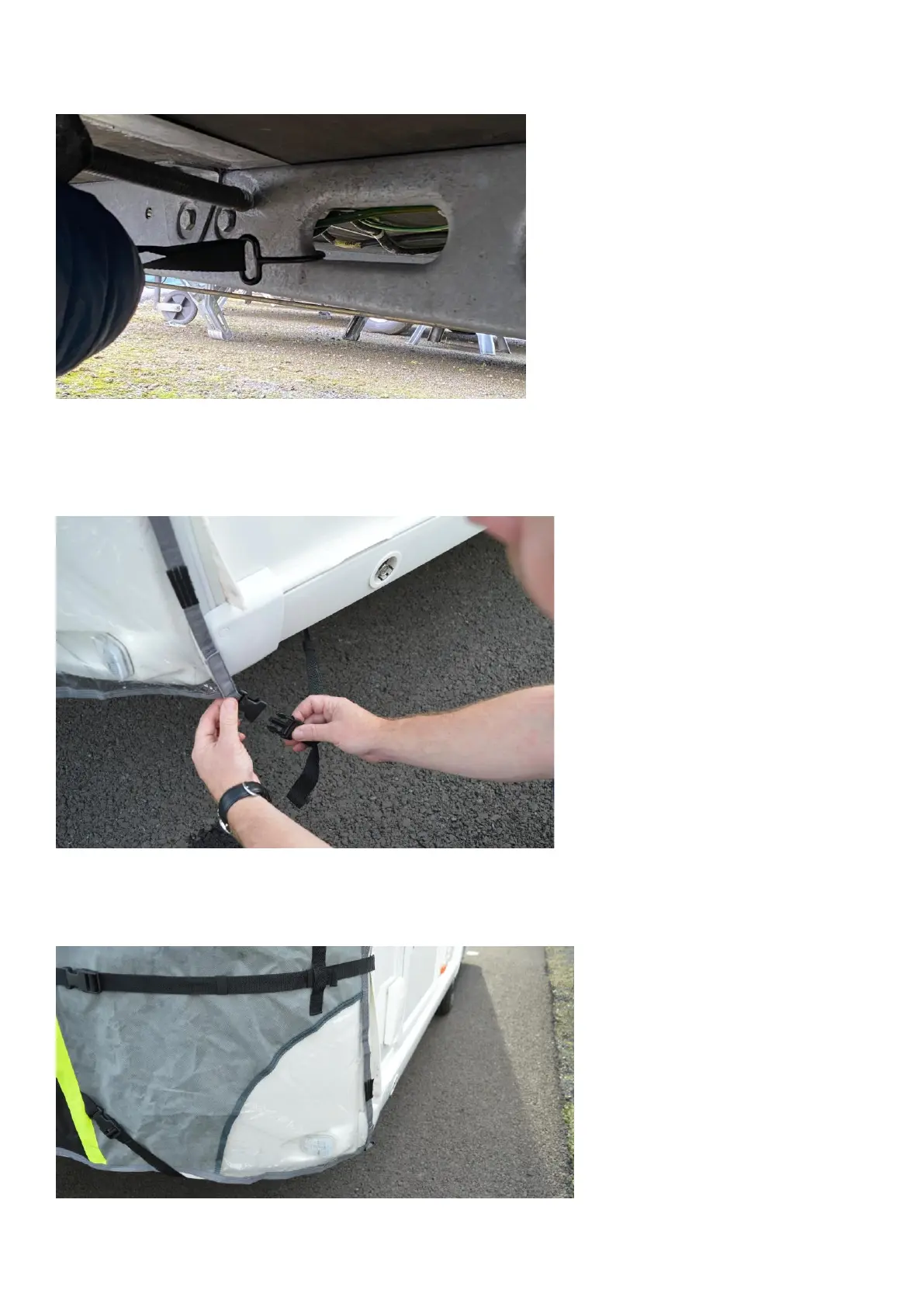 Pass the strap under the body work of your caravan and attach the hook to a fixed metal
