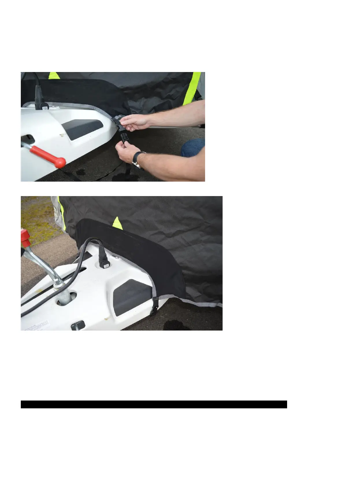 bottom of the cover. Pass the strap under the drawbar and secure into the opposite buckle.