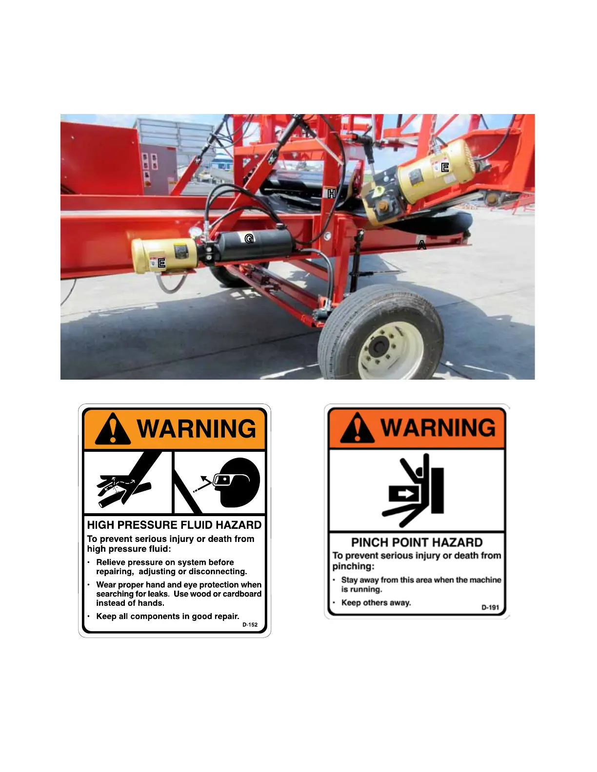 The types of safety signs and locations on the equipment are shown in the illustrations that follow. Good safety