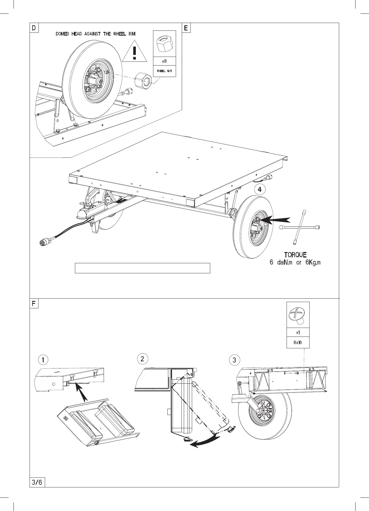 MayPole Erde MP6812 - Trailer Assembly Step D & E: Wheel Fitting; Wheel Fitting Orientation; Base Panel Securing; Wheel Nut Tightening