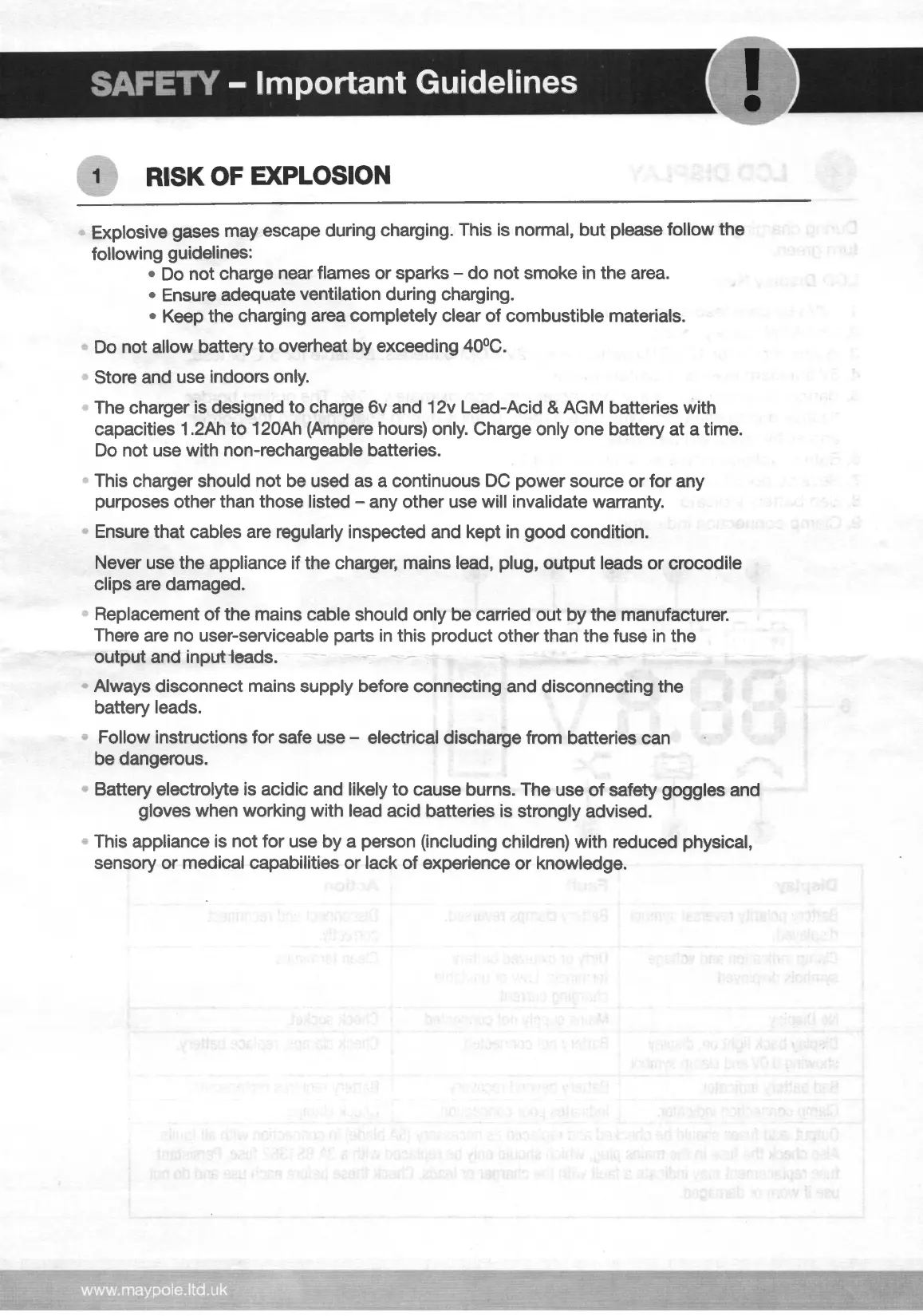 Never use the appliance if the charger, mains lead, plug, output leads or crocodile