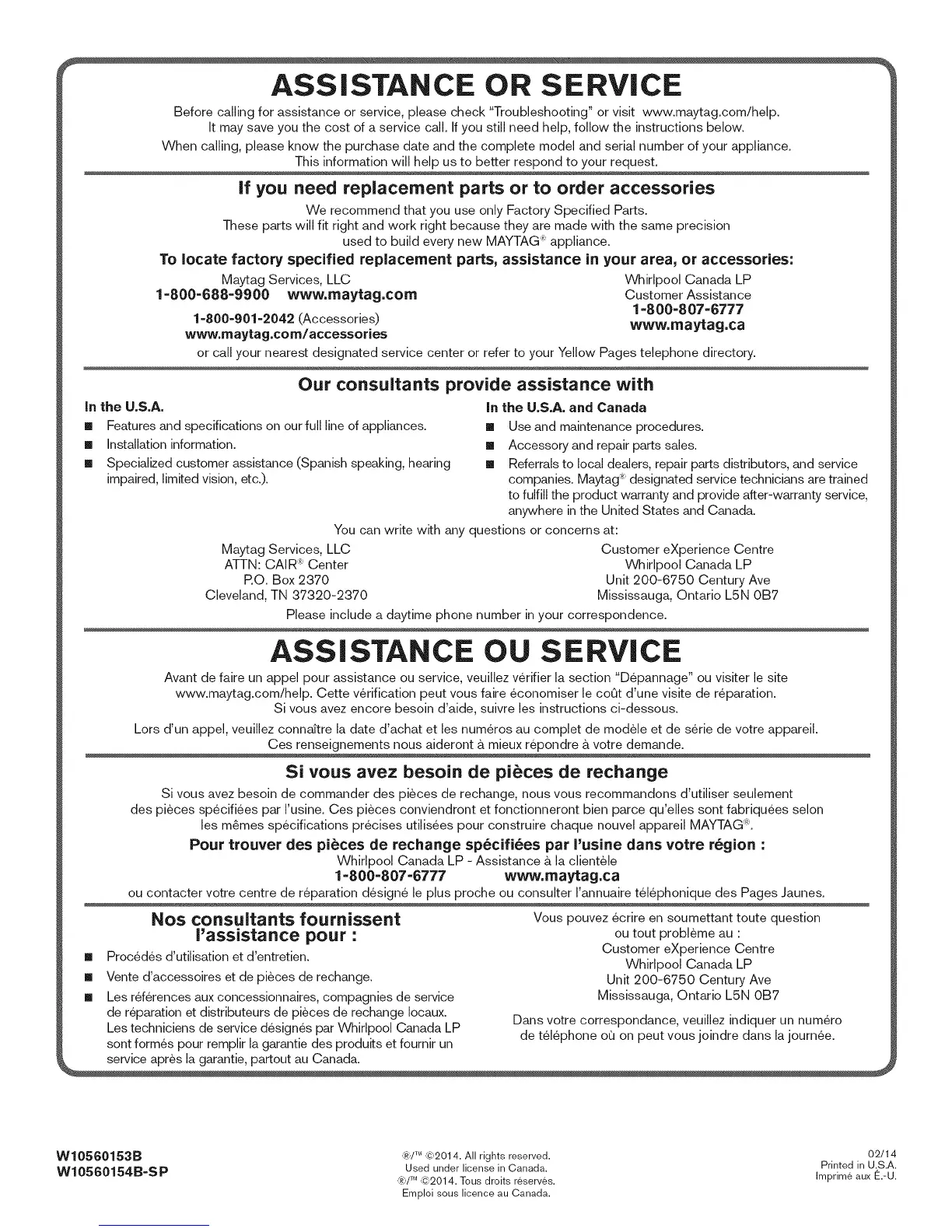 Before calling for assistance or service, please check "Troubleshooting" or visit www.maytag.com/help.