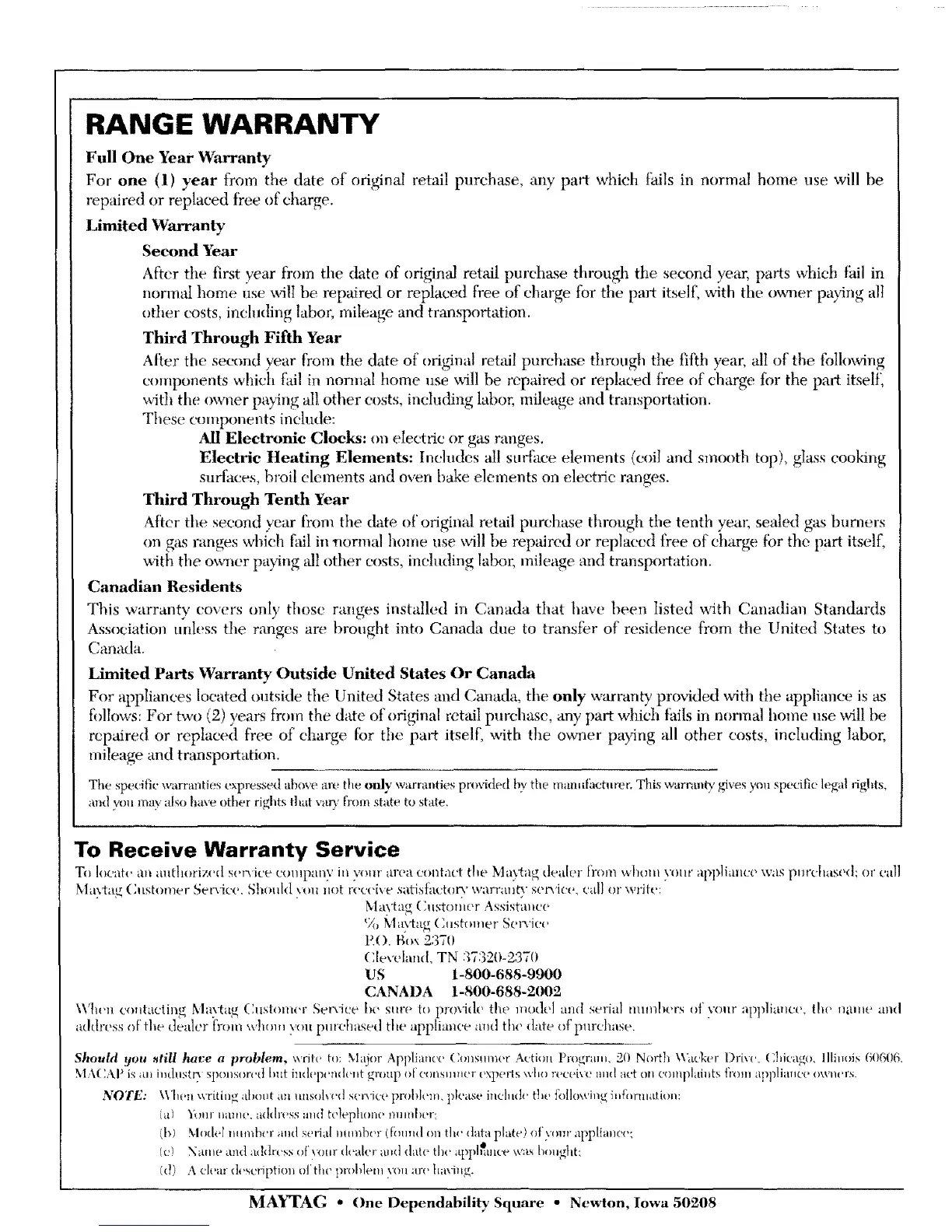 This warranty covers only those ranges installed in Canada that haw, been Iisted with Canadian Standards