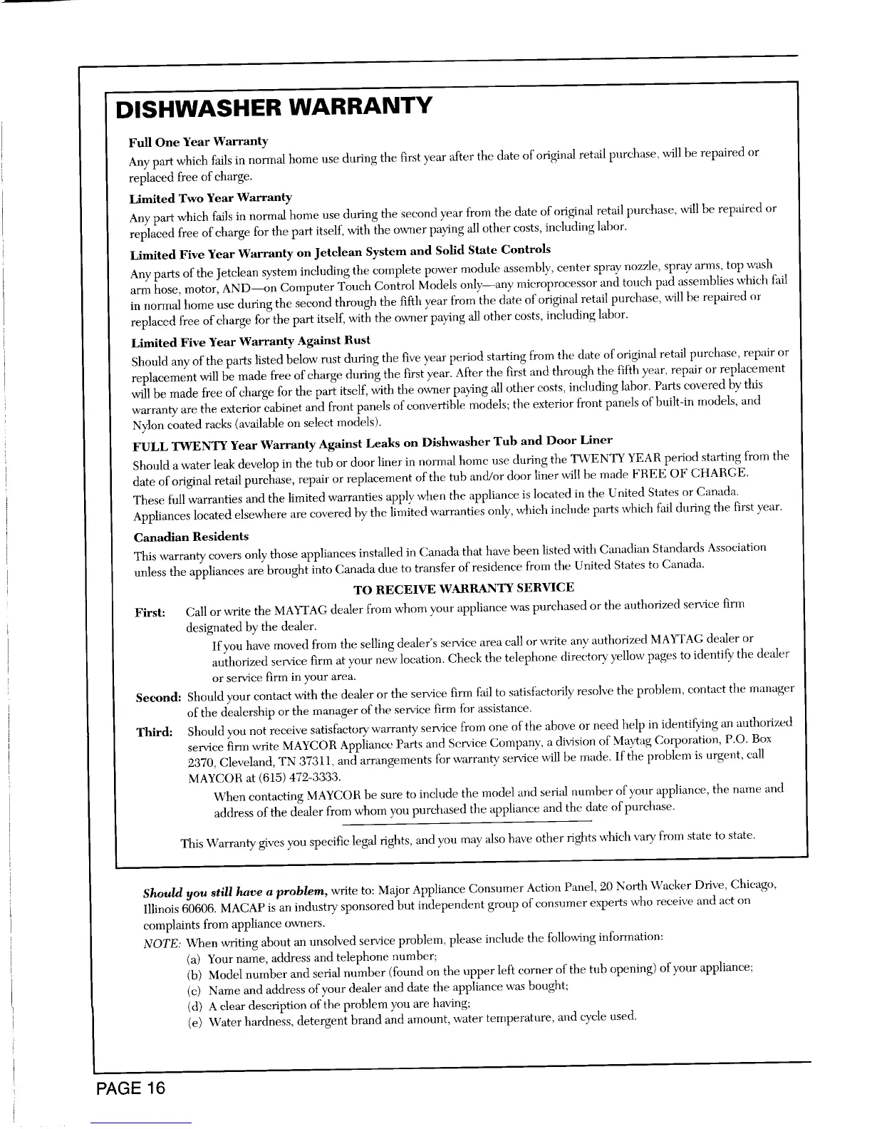 Should you still have a problem, write to: Major Appliance Consumer Action Panel, 20 North Wacker Drive, Chicago,