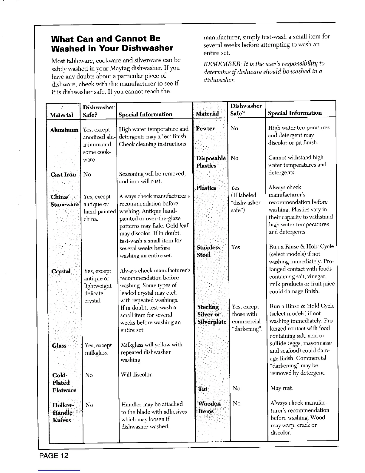 safely washed in your Maytag dishwasher. If you REMEMBER: It is the user's' responsibility to