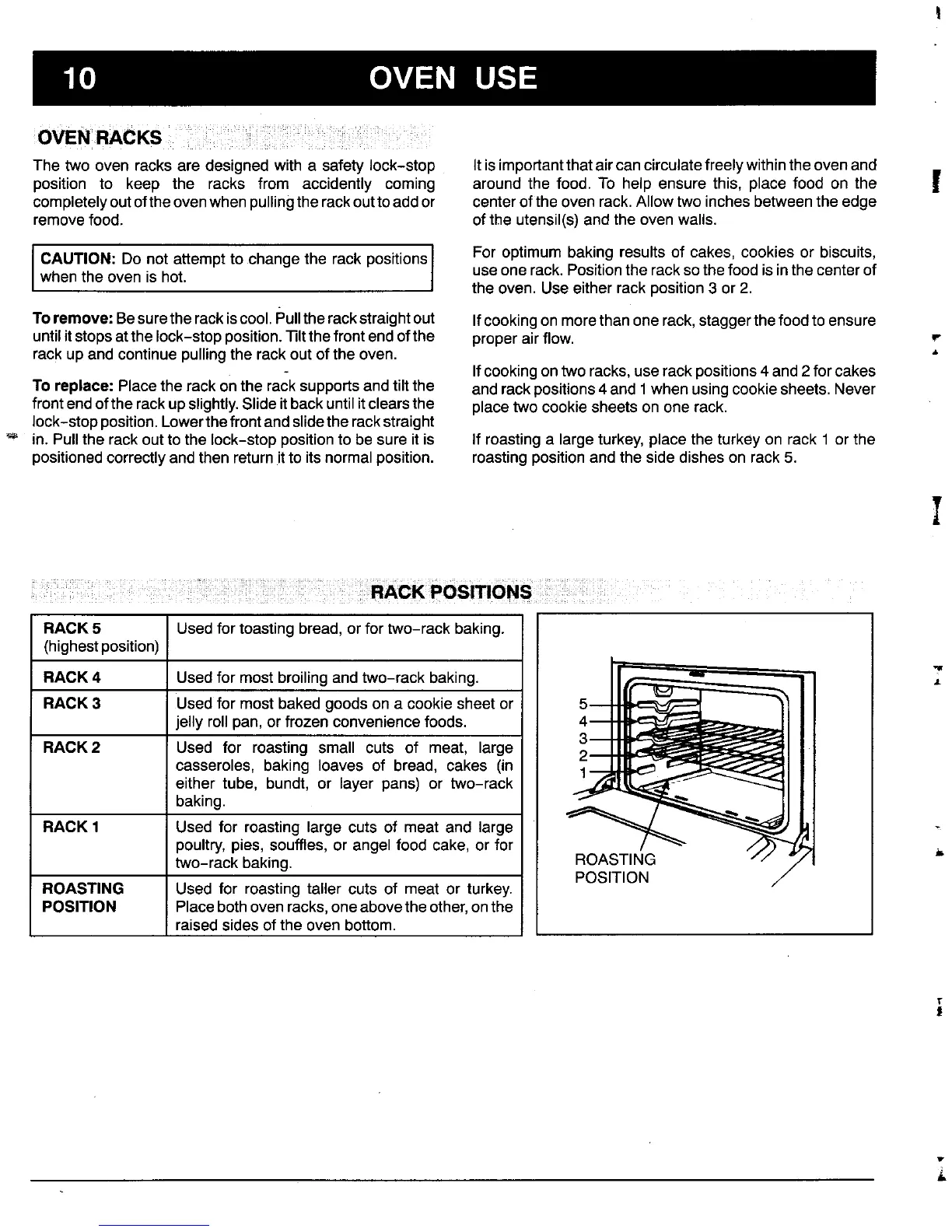 I CAUTION:Do not attemptto changethe rack positionsI For optimum baking results of cakes, cookies or biscuits,whenthe oven is hot. J use onerack.Positionthe racksothefood isinthecenterof