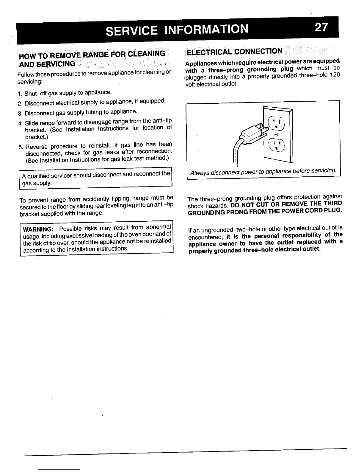 To prevent range from accidently tipping,range must be The three-prong groundingplug offersprotectionagainst