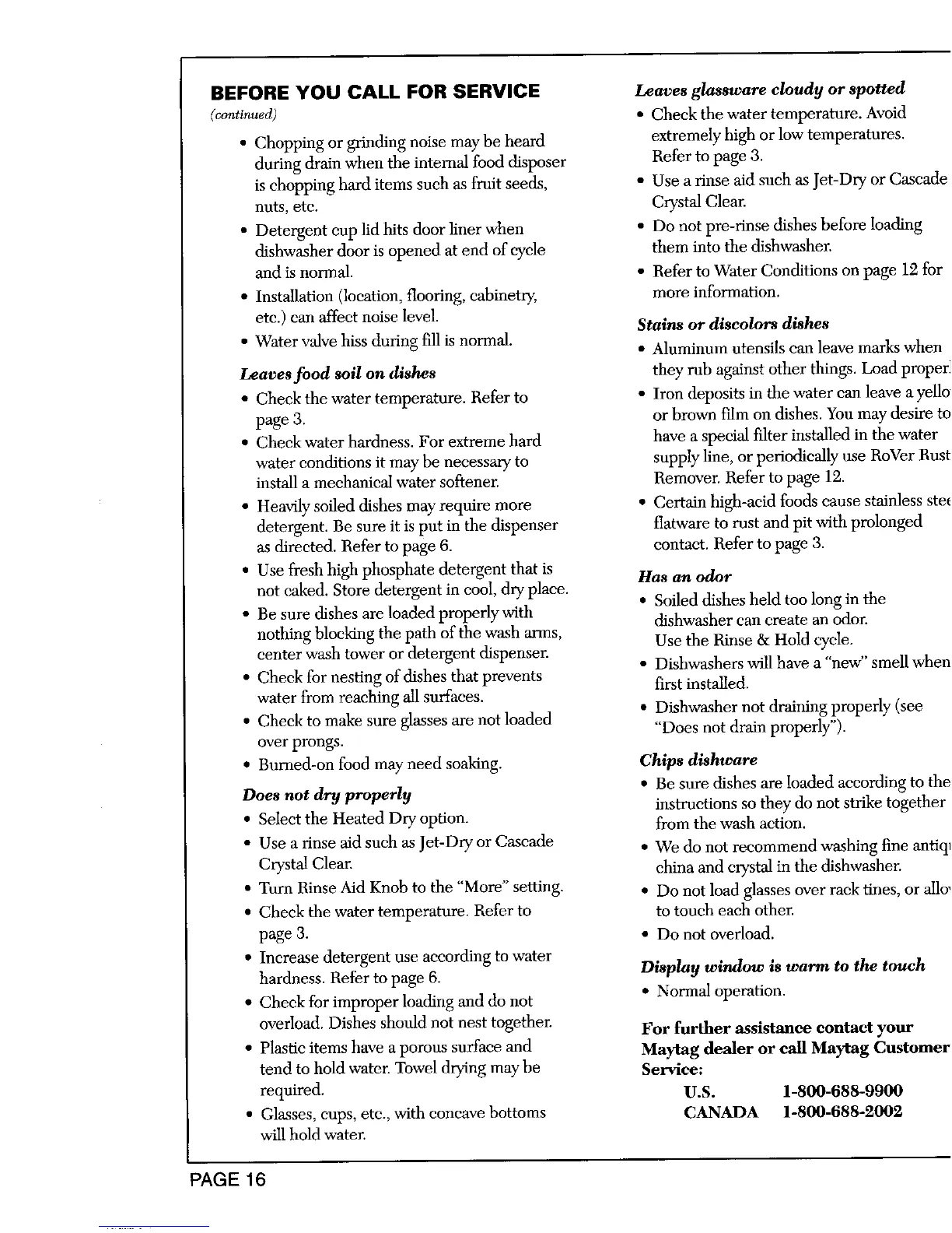 BEFORE YOU CALL FOR SERVICE Leaves glassware cloudy or spotted