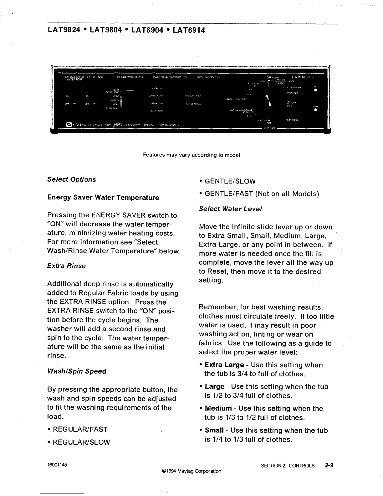 Maytag LAT8014 - LAT9824, LAT9804, LAT8904, LAT6914 Controls; Select Options; Select Water Level