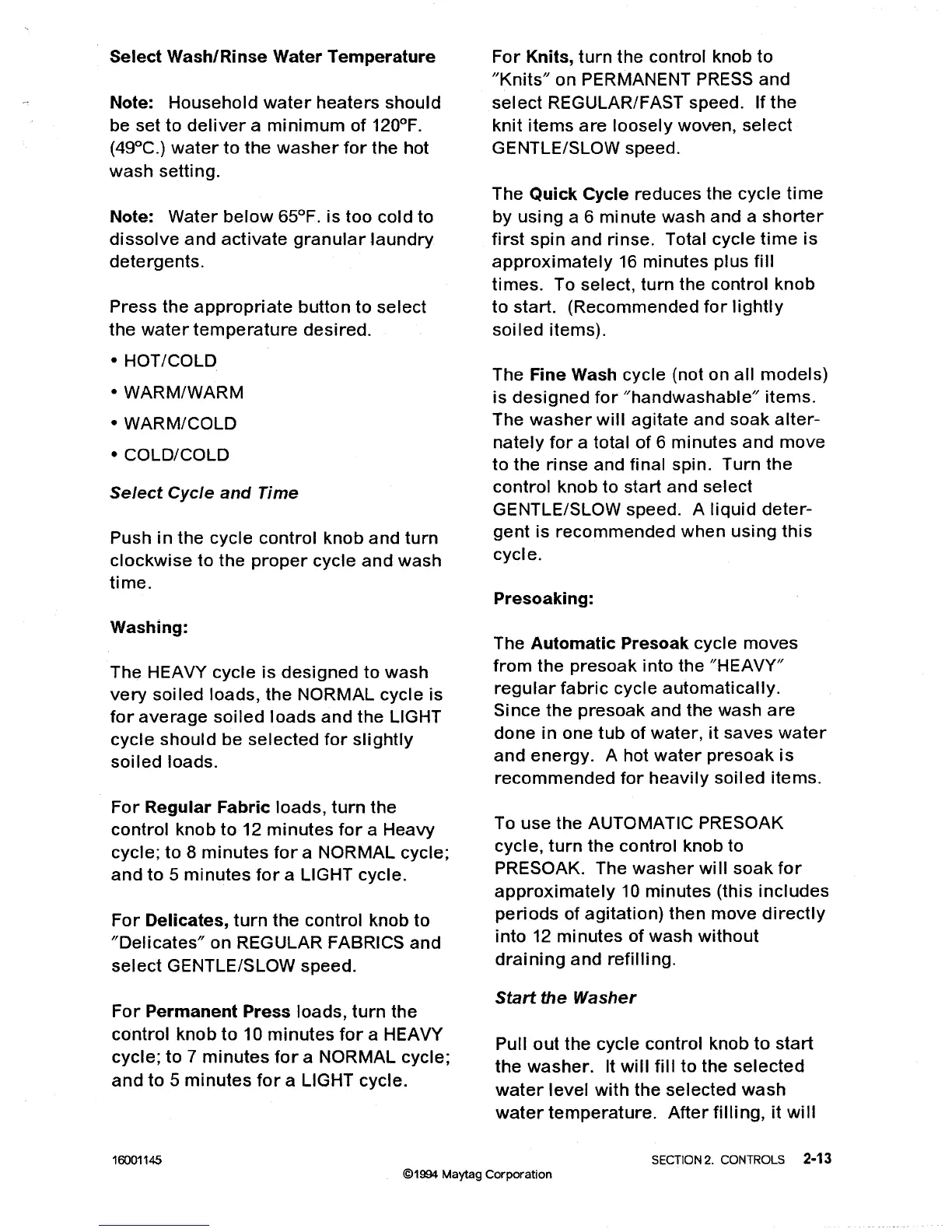 Maytag LAT8014 - Select Wash;Rinse Water Temperature; Select Cycle and Time; Washing Instructions; Presoaking Instructions