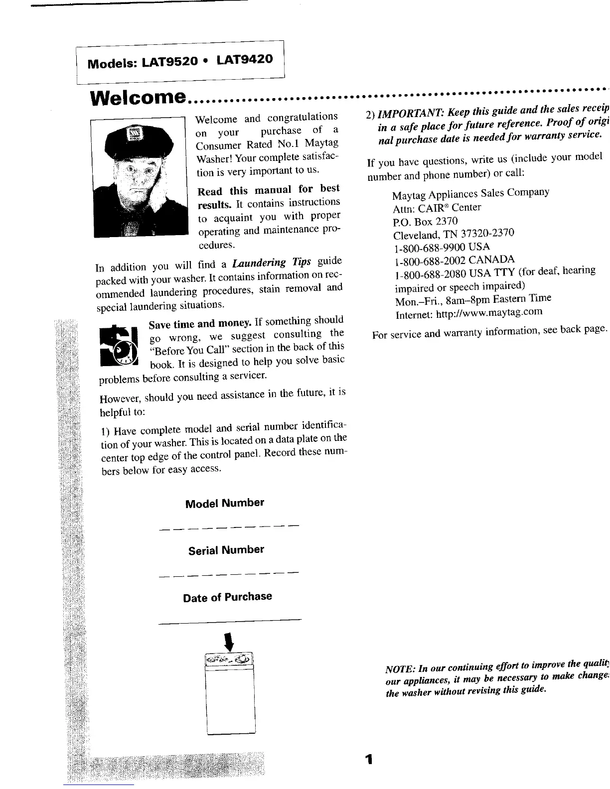 Save time and money. If something should Internet: http://www.maytag.com