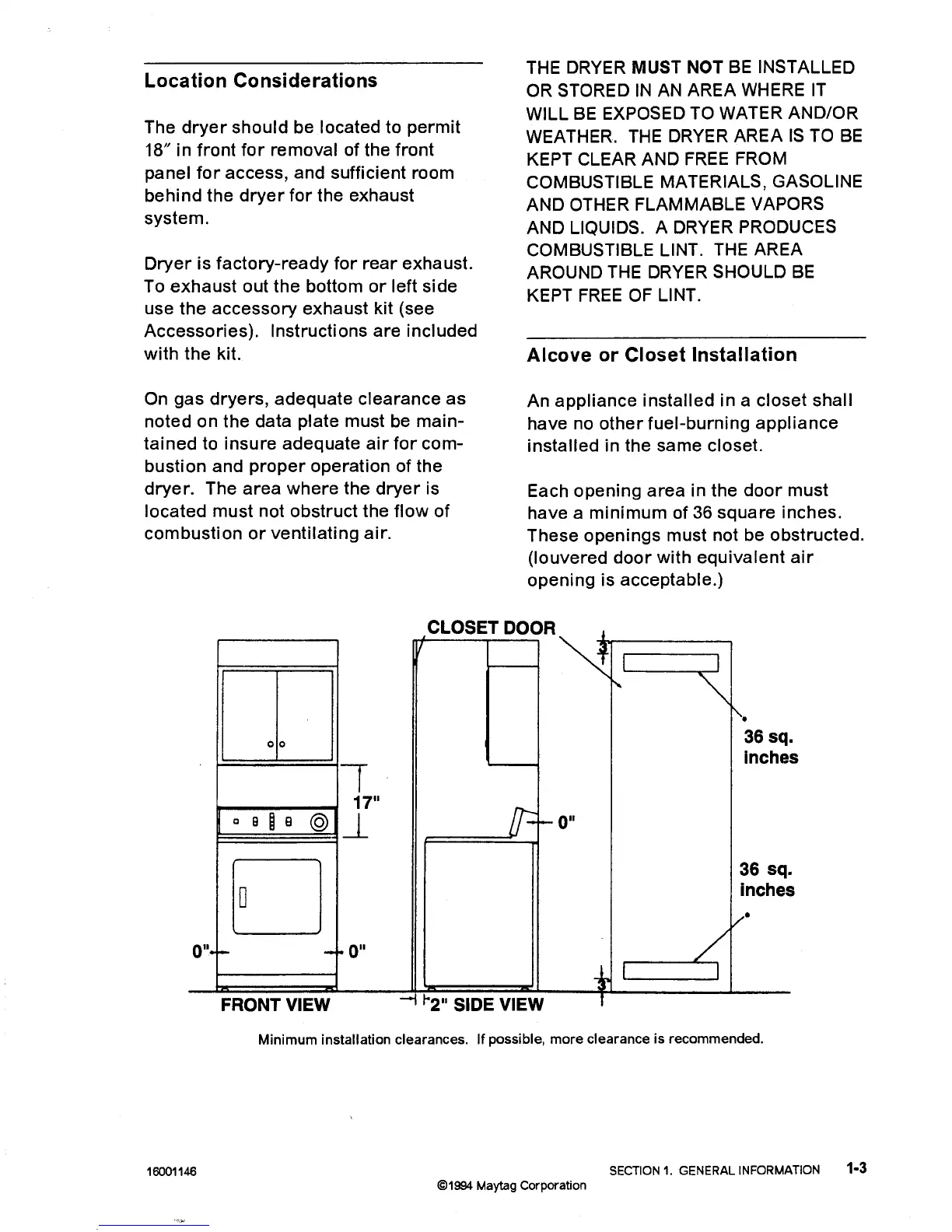 Maytag LD5004 - Location Consideration; Alcove or Closet Installation