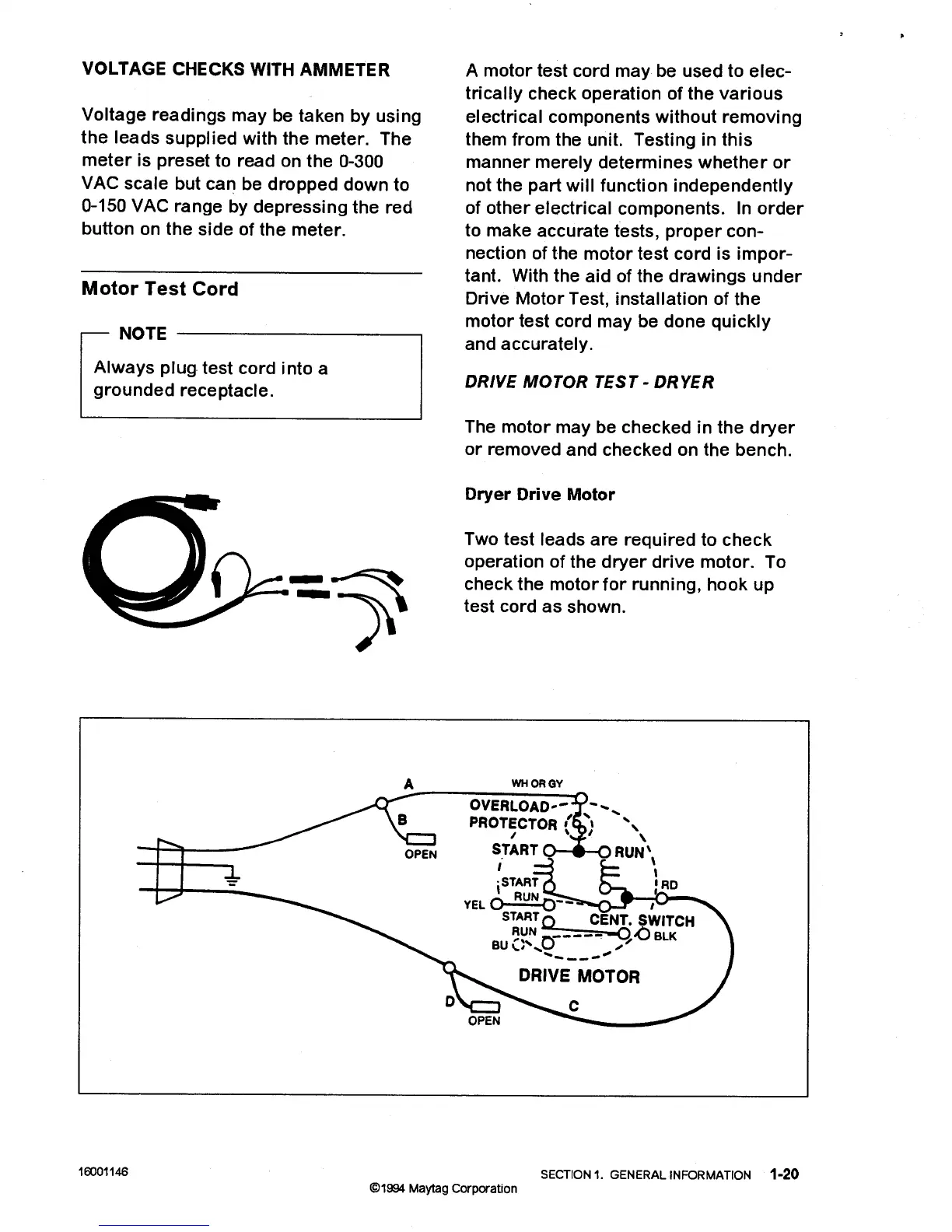 Maytag LD5004 - Voltage Checks with Ammeter; Motor Test Cord; Dryer Drive Motor