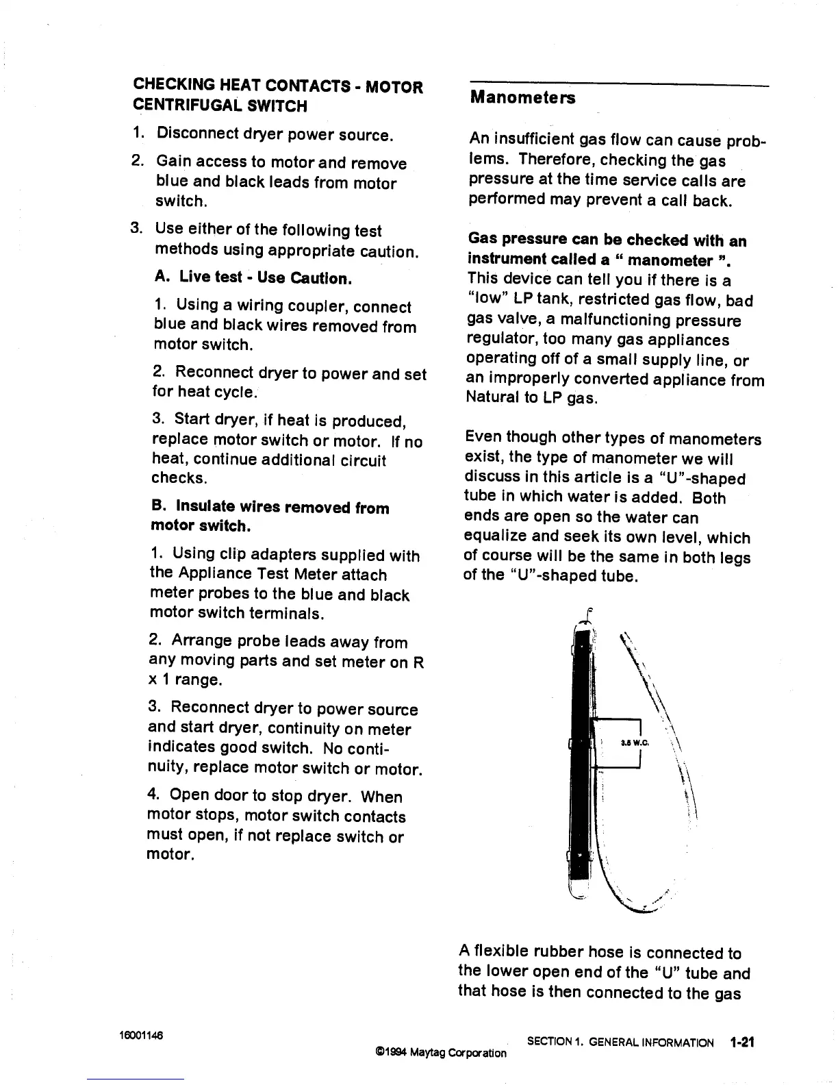 Maytag LD5004 - Checking Heat Contacts - Motor Centrifugal Switch; Manometers