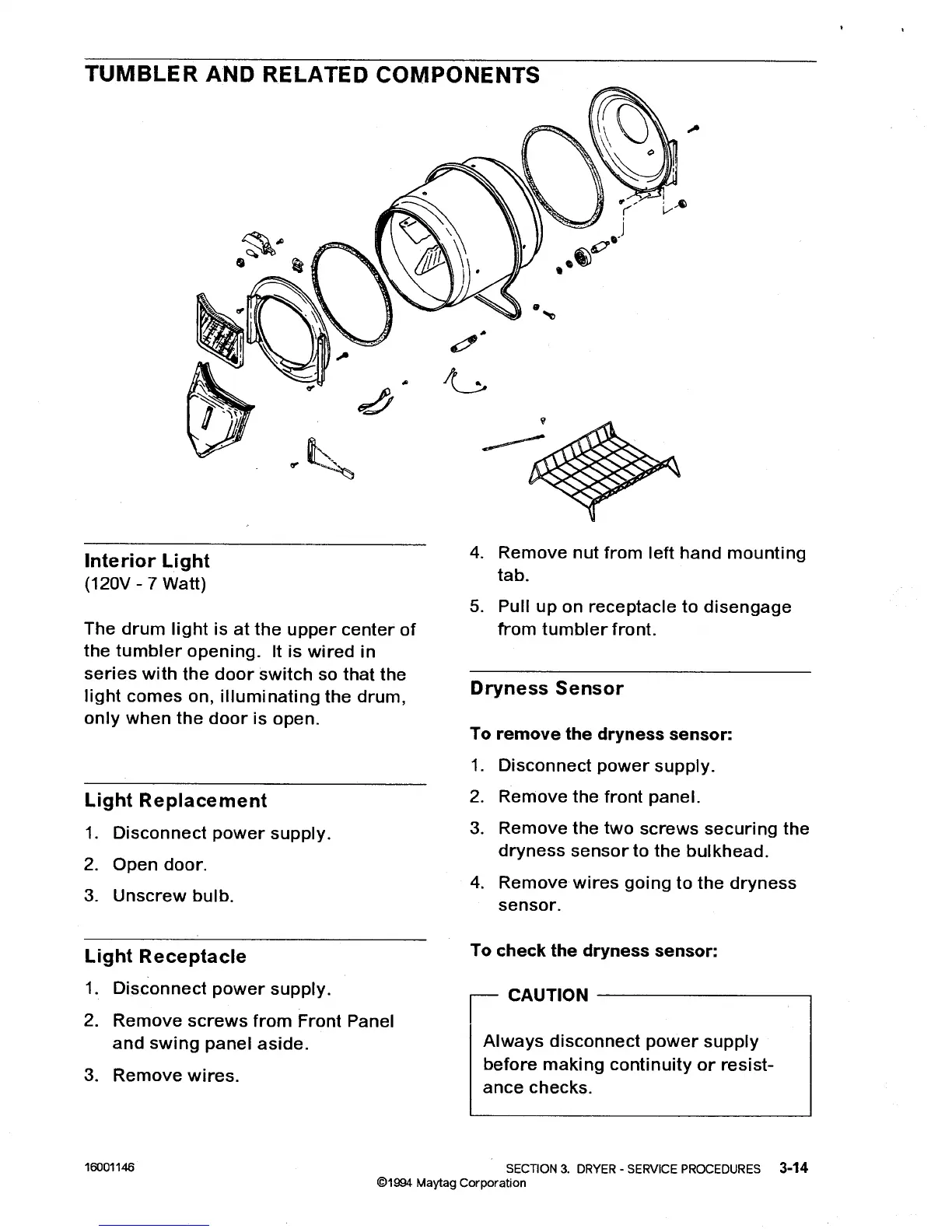 Maytag LD5004 - Tumbler and Related Components; Interior Light Replacement; Light Receptacle; Dryness Sensor Removal and Check