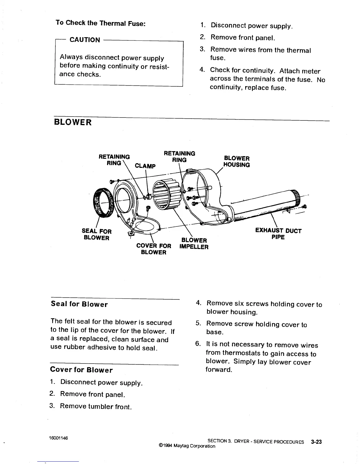 Maytag LD5004 - Blower Diagram; Seal for Blower; Cover for Blower; To Check the Thermal Fuse