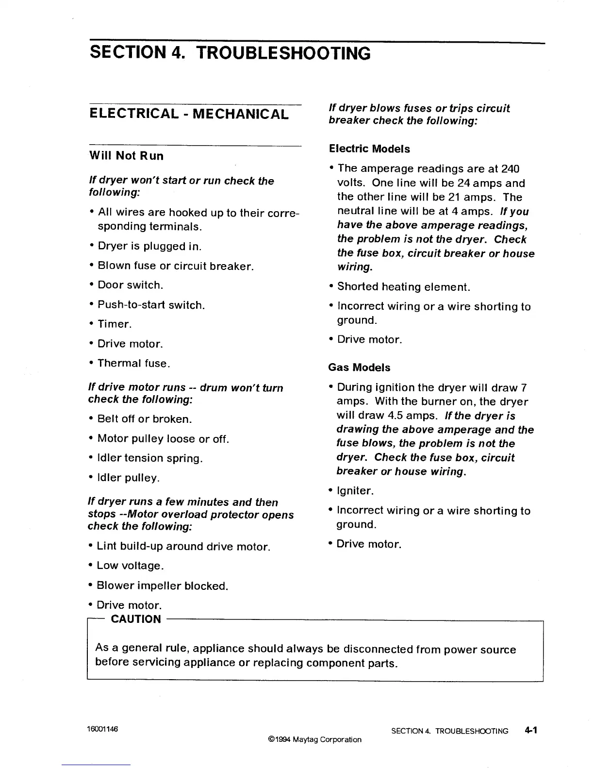 Maytag LD5004 - Troubleshooting; If Dryer Wont Start; If Drive Motor Runs - Drum Wont Turn; If Dryer Runs a few Minutes and then Stops