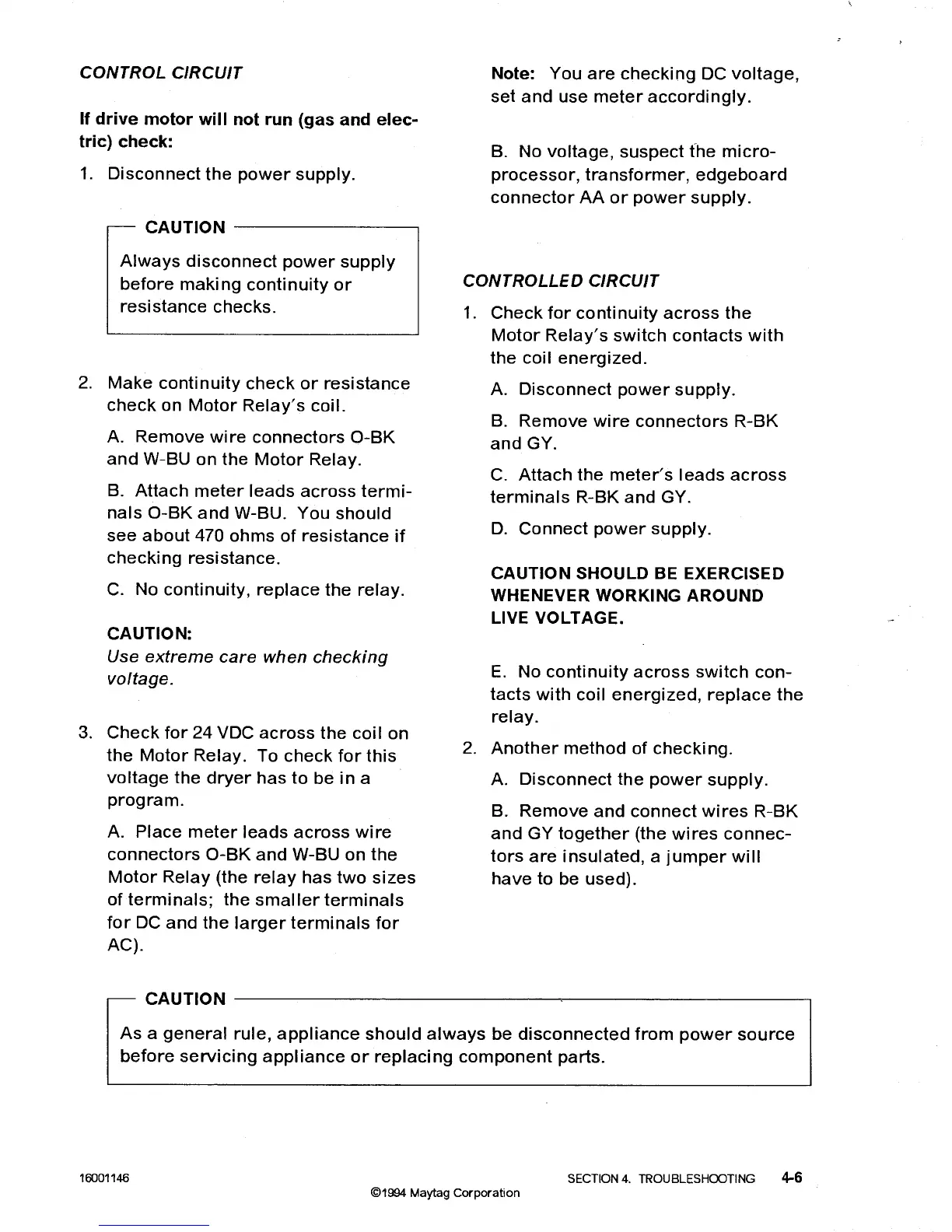 Maytag LD5004 - Control Circuit; Controlled Circuit; If Drive Motor will Not Run (Gas and Electric)