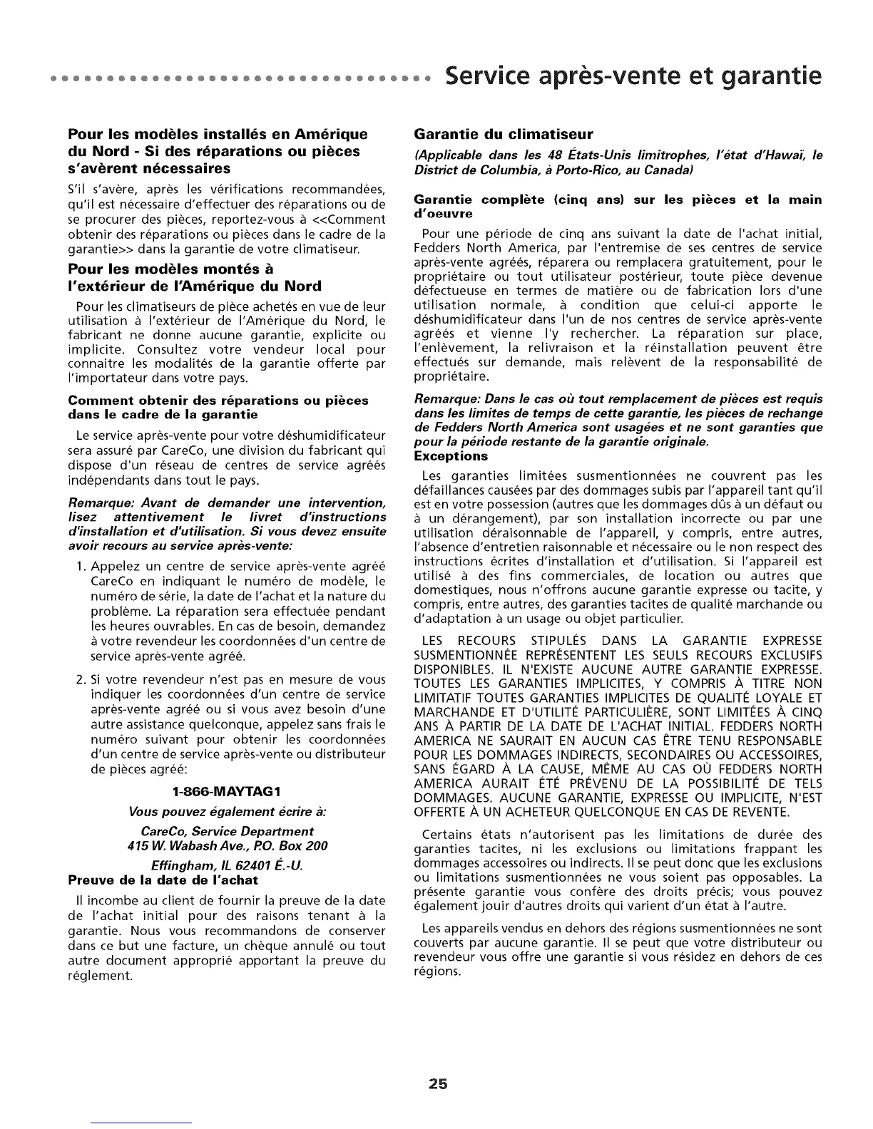 de Fedders North America sont usagees et ne sont garanties que