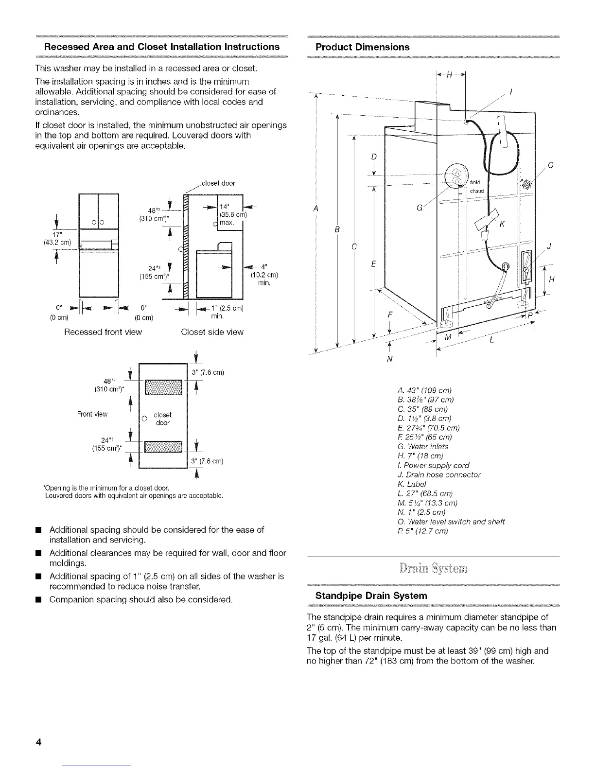 • Additional spacing of 1" (2.5 cm) on all sides of the washer is