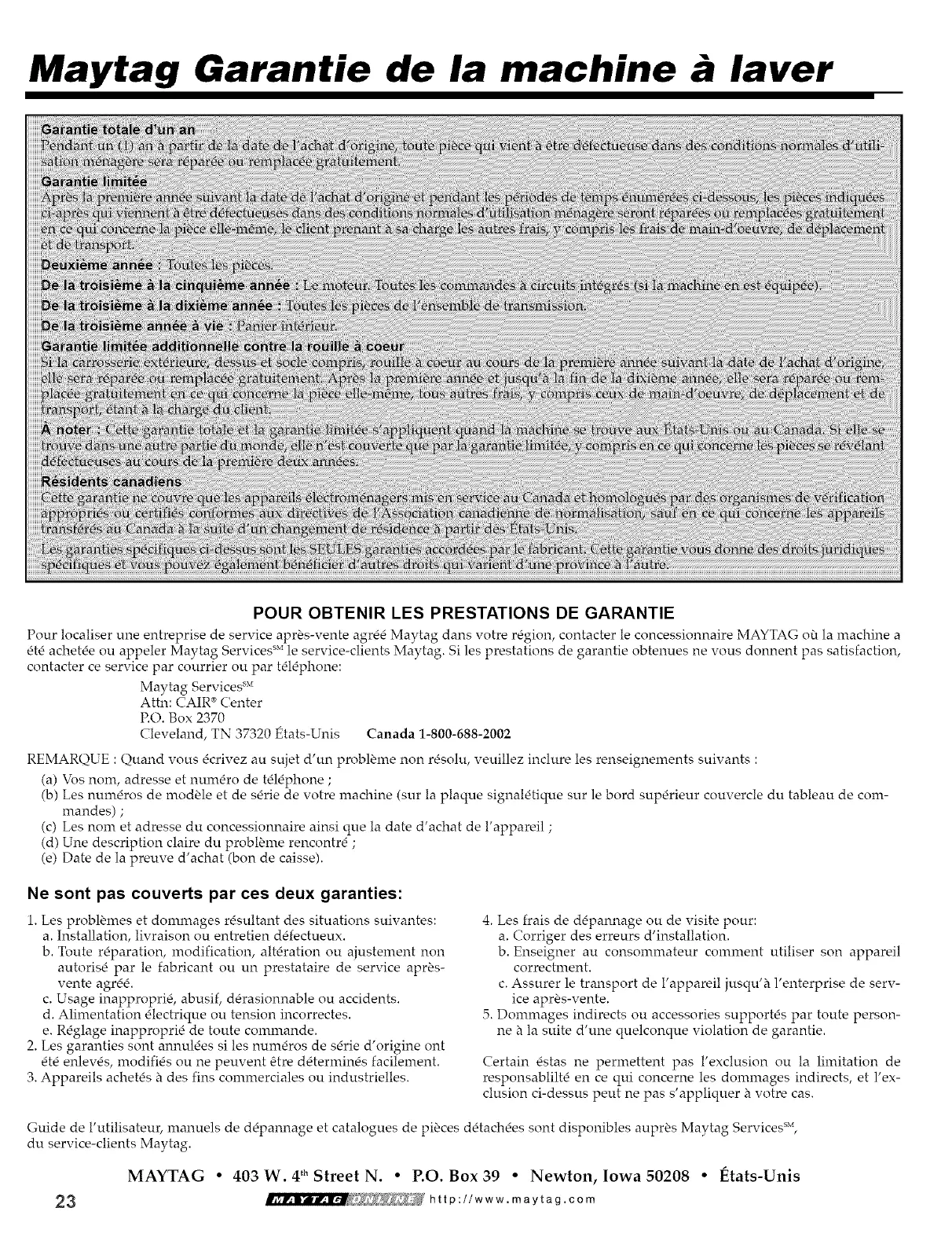 0tO achetOe ou appeler Maytag Services _: le service-clients Maytag. Si les prestations de garantie obtenues ne vous donnent pas satisfaction,