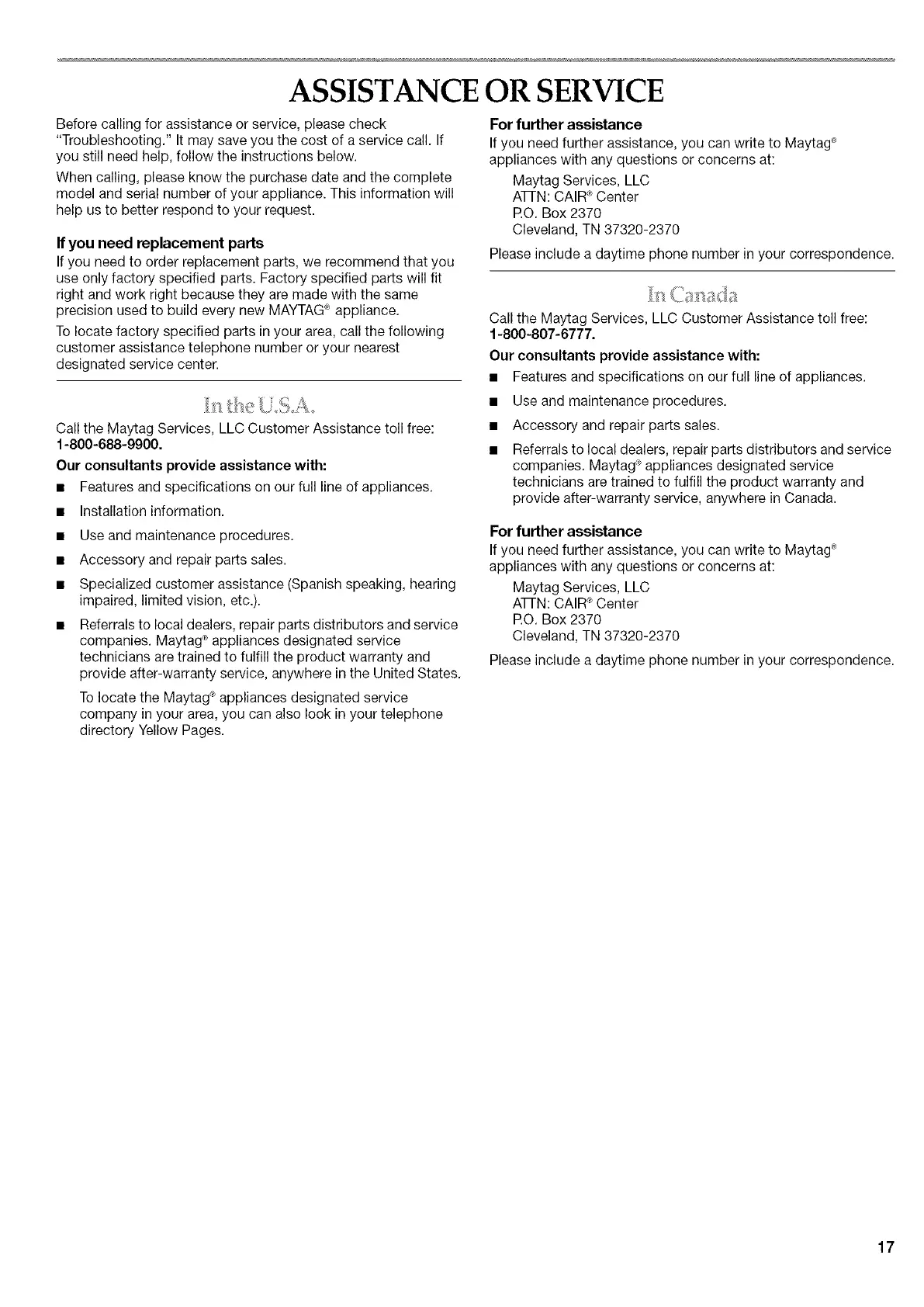 Call the Maytag Services, LLC Customer Assistance toll free: