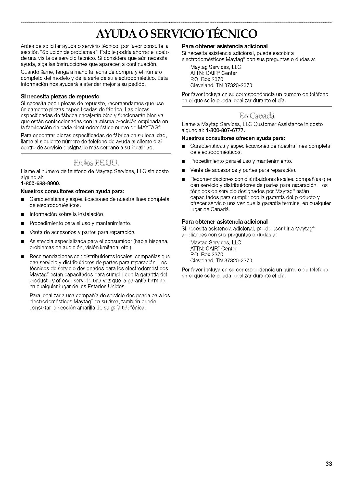 Llame al nQmero de telefono de Maytag Services, LLC sin costo