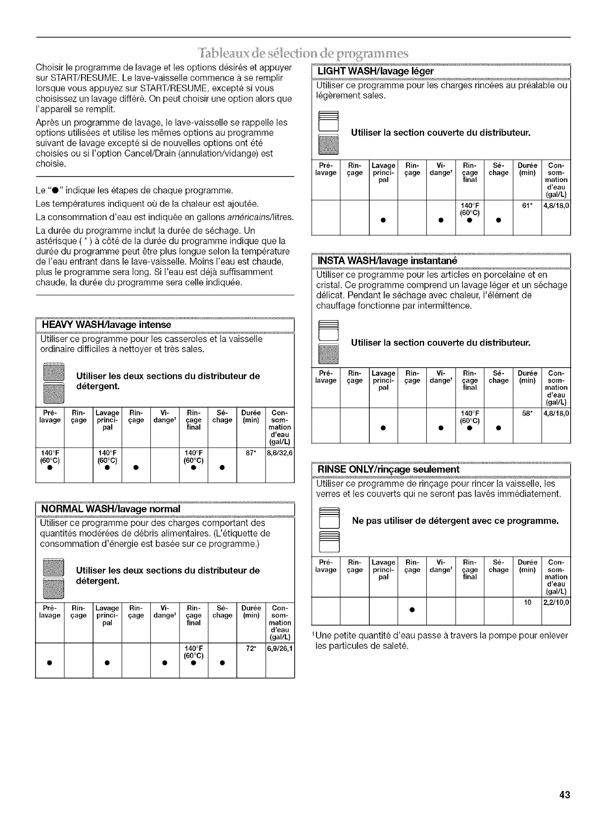 La consommation d'eau est indiquee en gallons am_ricains/litres.