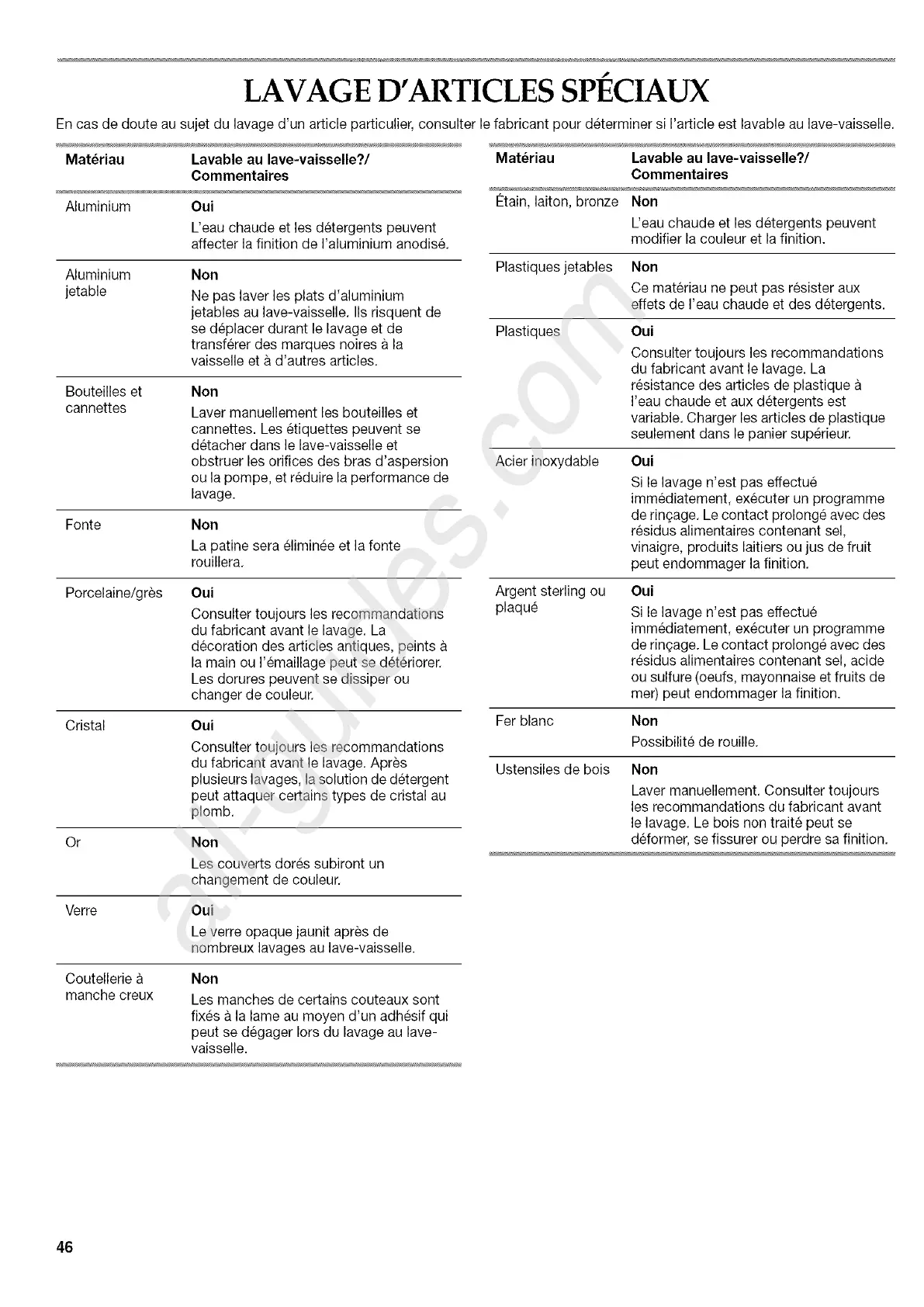 En cas de doute au sujet du lavage d'un article particulier, consulter le fabricant pour determiner si I'article est lavable au lave-vaisselle.