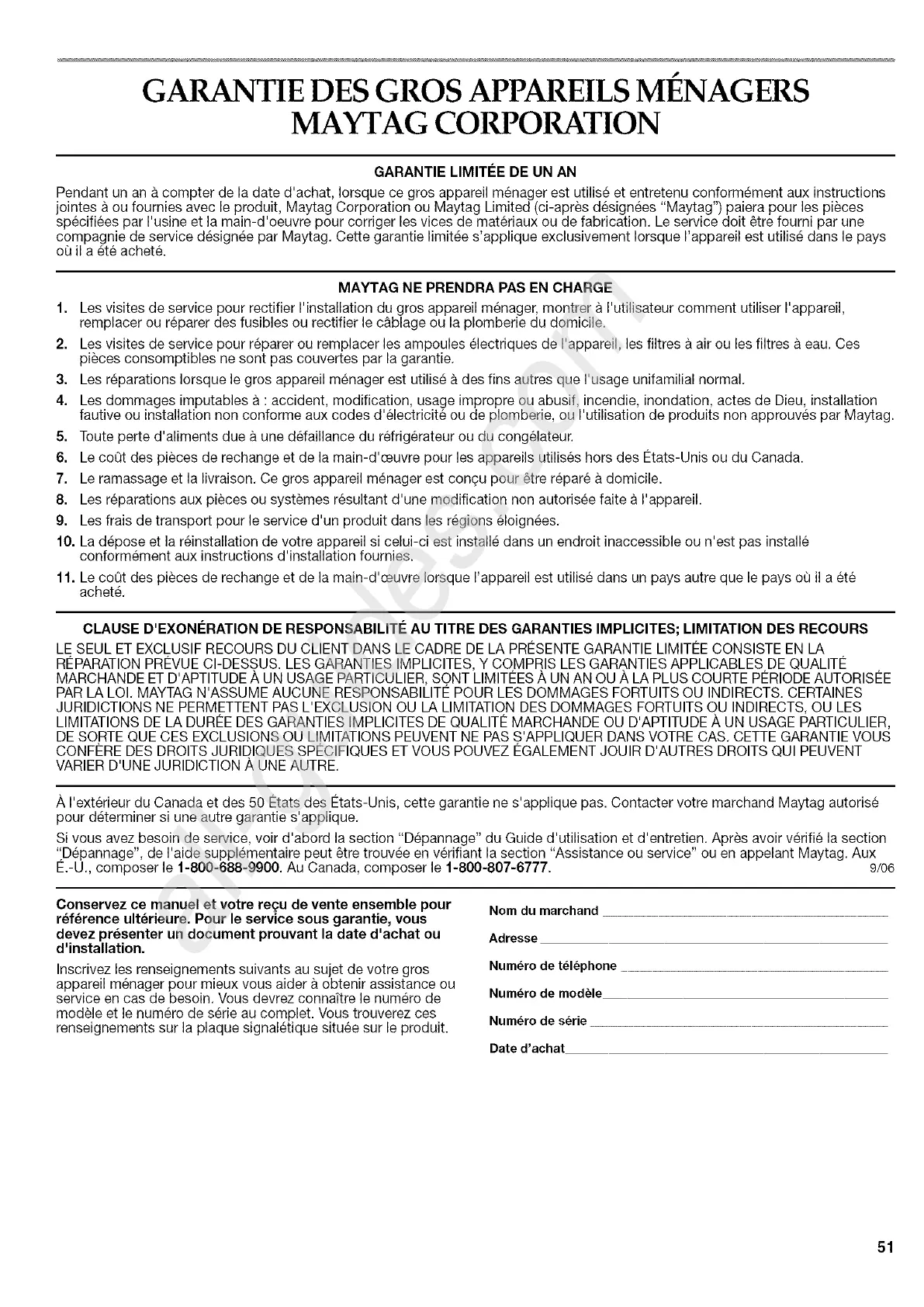 /_,I'exterieur du Canada et des 50 12tatsdes Ctats-Unis, cette garantie ne s'applique pas. Contacter votre marchand Maytag autorise