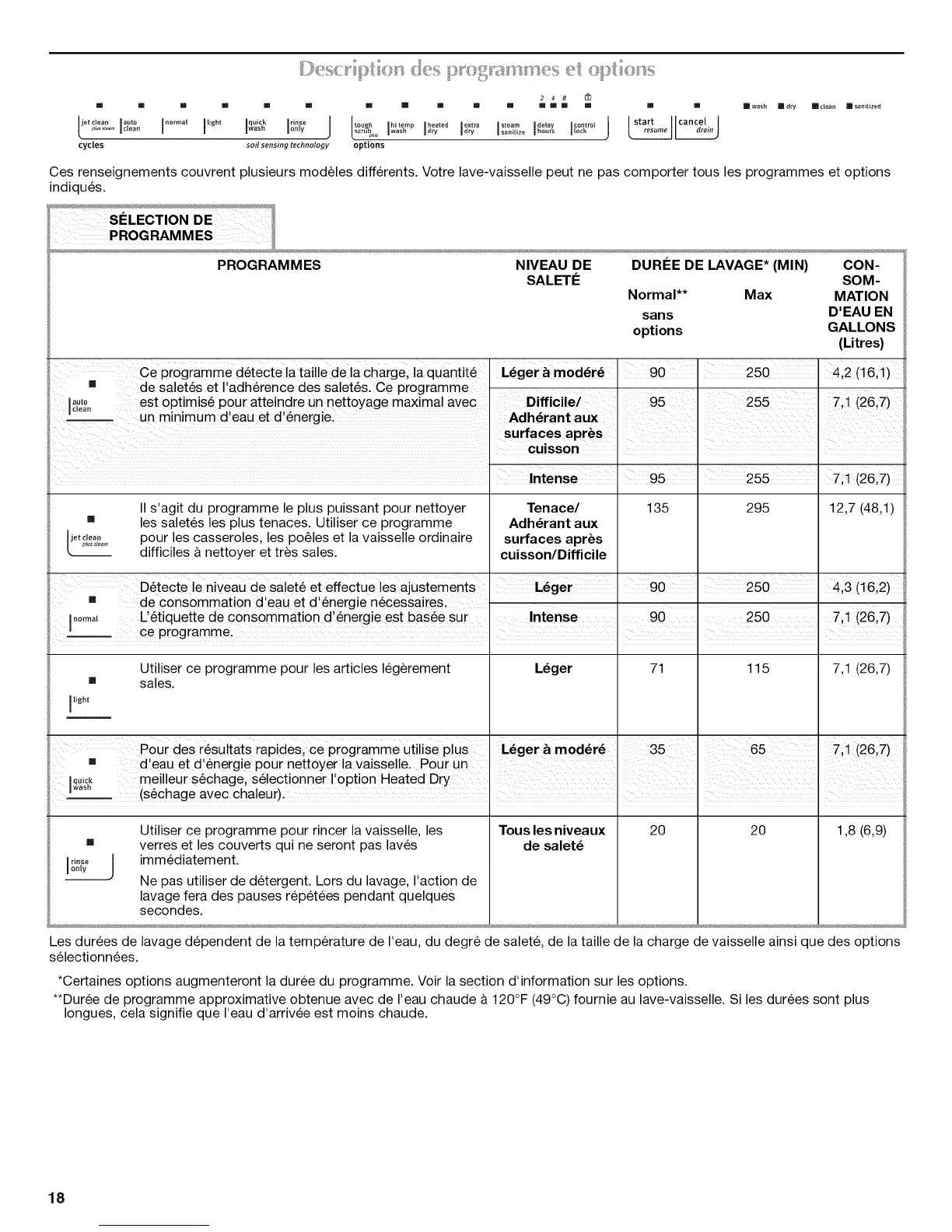 **Duree de programme approximative obtenue avec de I'eau chaude a 120°F (49°C) fournie au lave-vaisselle. Siles durees sont plus