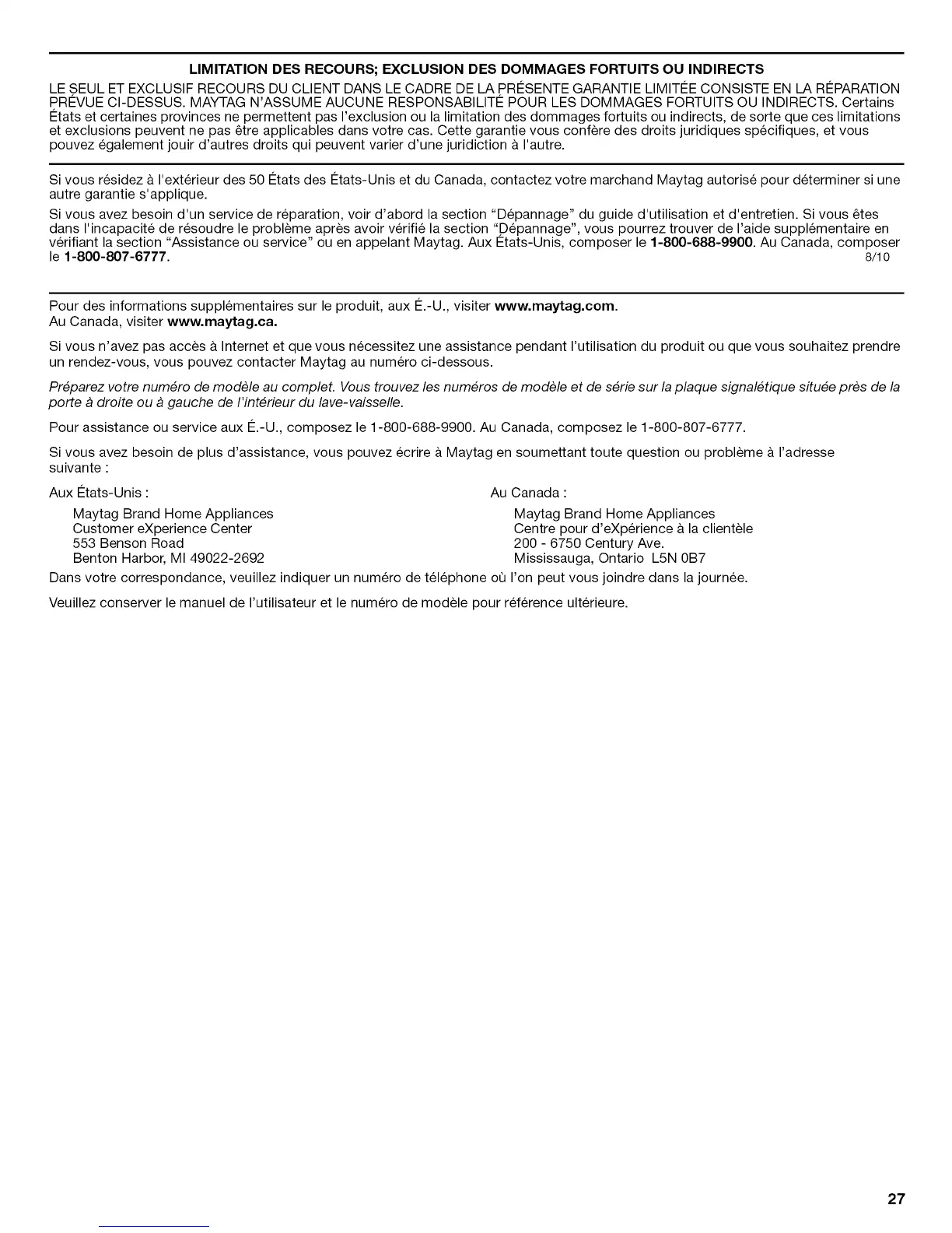 PRI2VUE CI-DESSUS. MAYTAG N'ASSUME AUCUNE RESPONSABILITI 2 POUR LES DOMMAGES FORTUITS OU INDIRECTS. Certains