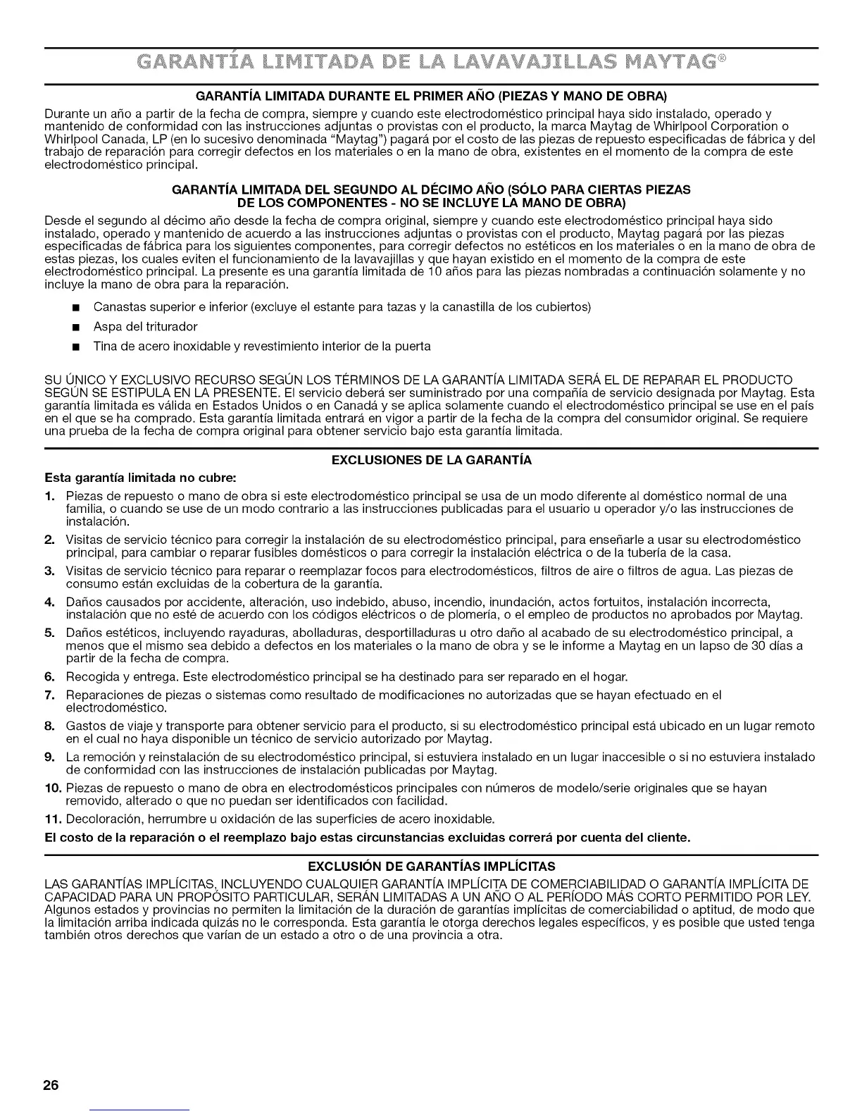 mantenido de conformidad con las instrucciones adjuntas o provistas con el producto, la marca Maytag de Whirlpool Corporation o